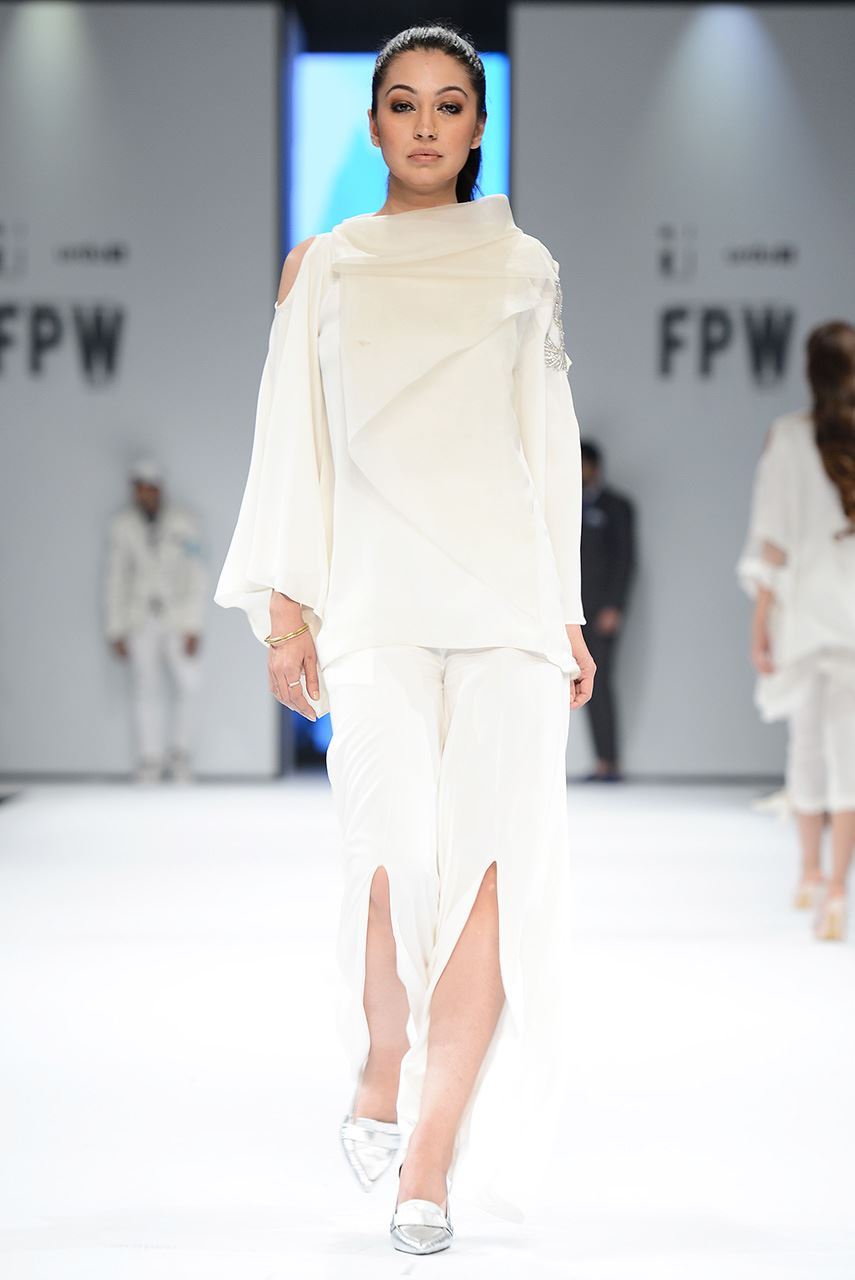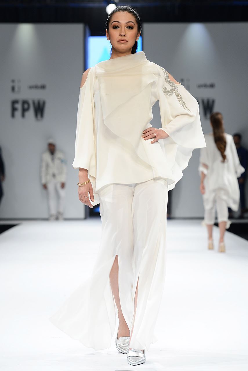 Georgette top with organza collar and cut out sleeves embellished with hand worked silver motif paired with linen palazzo with a slit.