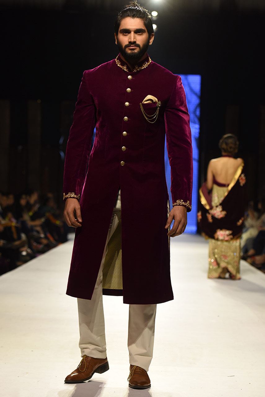 An edgy plum velvet sherwani with hand embroidered collar and sleeves finished with golden metal buttons and delicate detail on the pocket paired with white plain trousers.