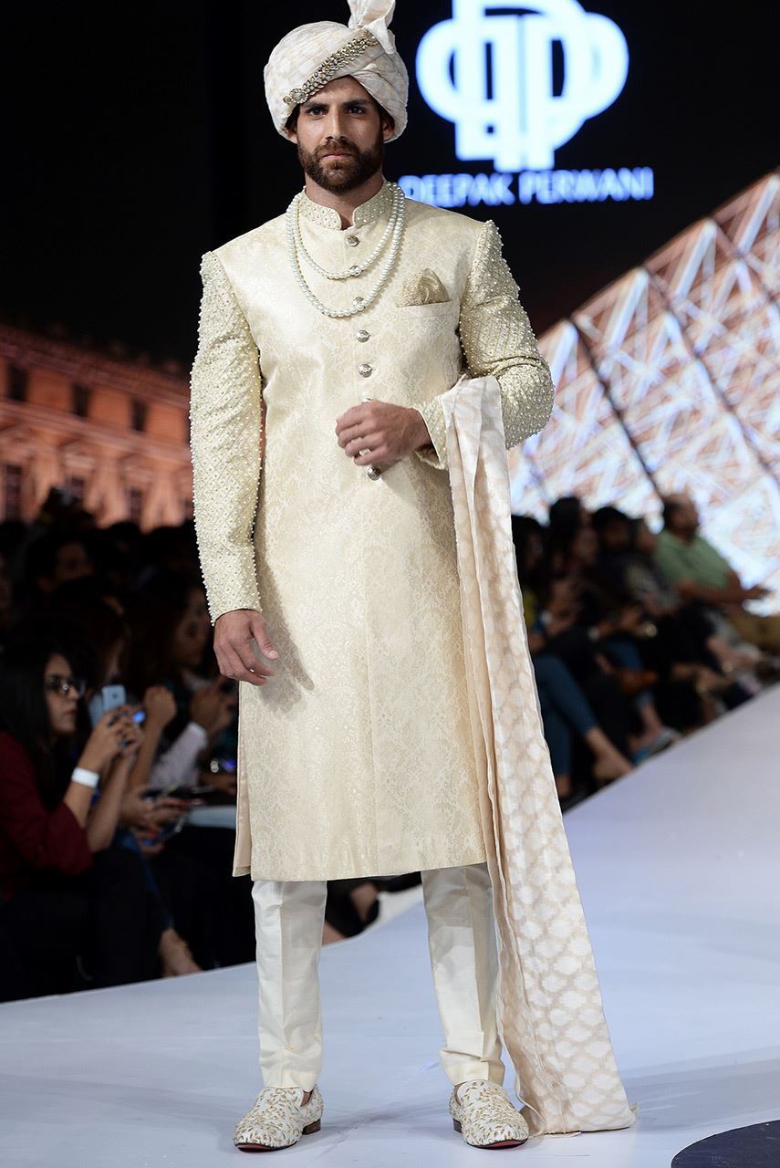Light gold self pattern brocade with classic pearl and aari hand embroidery paired with a pajama and shoes, styled with ivory and gold maysuri turban.