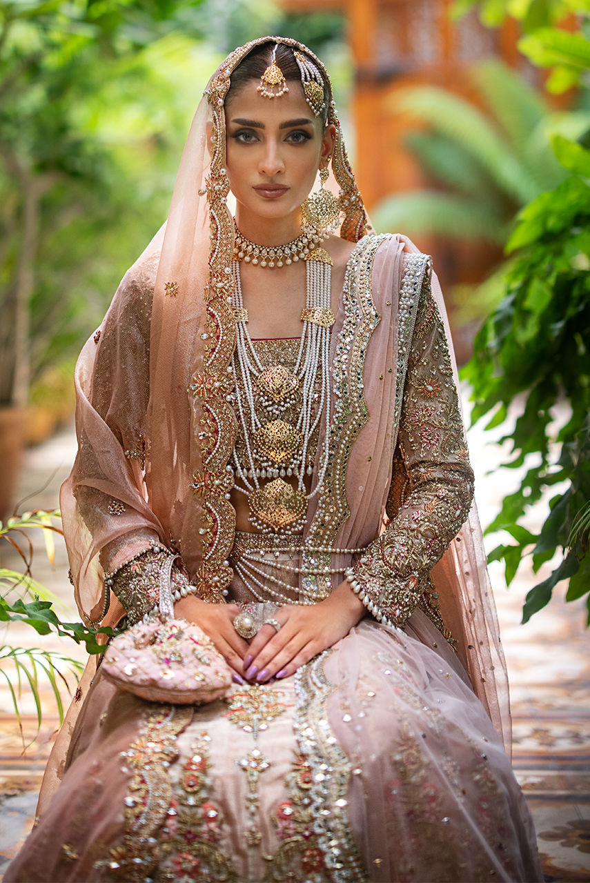 Our ethereal bridal with breathtaking details in shades of gold, blush pink and fuchsia. The maysuri choli and lehnga are extensively hand worked in resham, zardozi, crystals, pearls and french knot. Paired with a blush pink dupatta with hand worked scallop in zardozi, resham and crystals. Additional dupatta is in net hand worked in sheesha and pearls