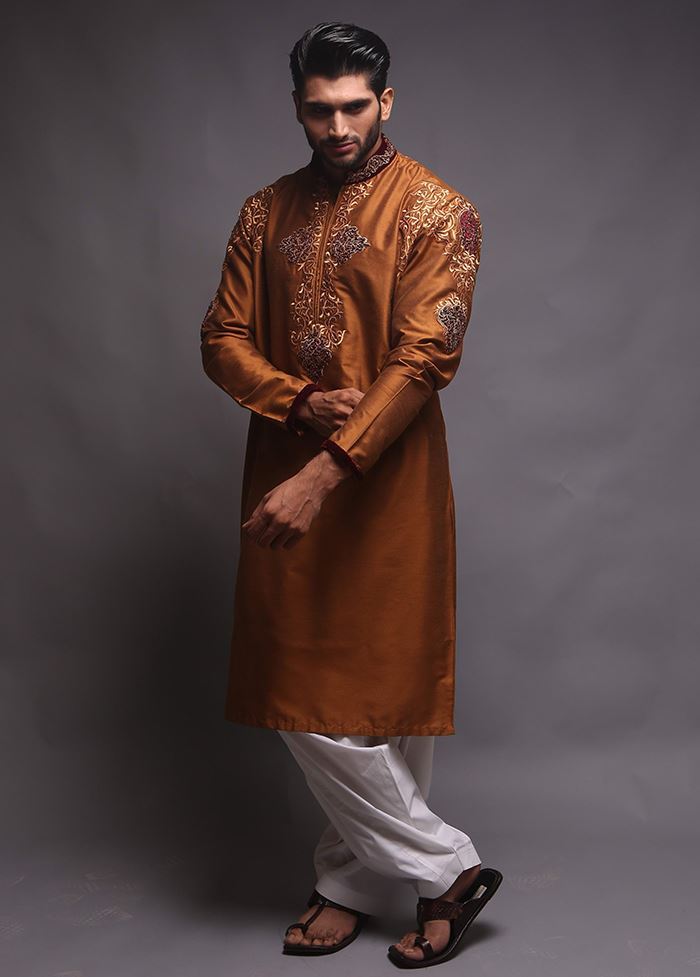 Brown embroidered cotton silk kurta.
