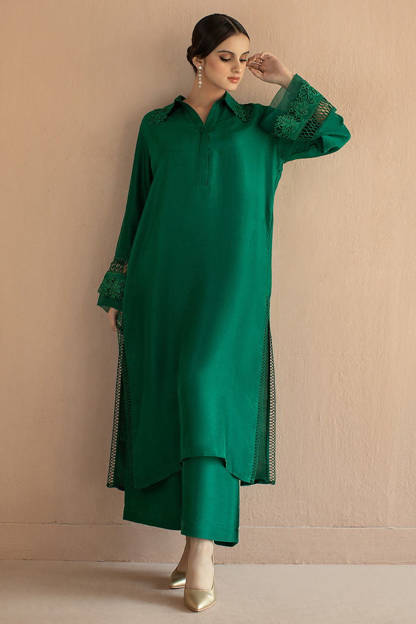 Color: Green Fabric: Raw Silk Work Details: Lace Detailing