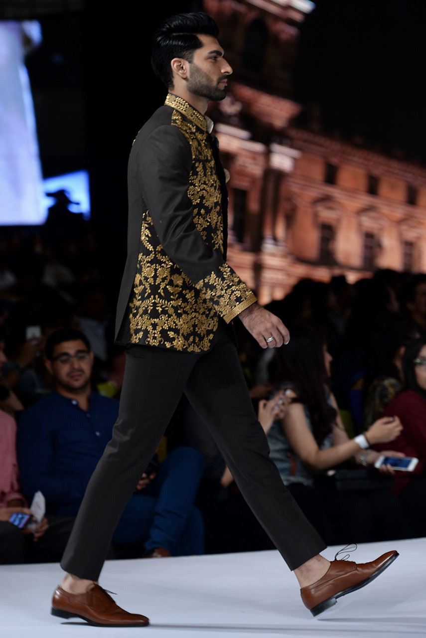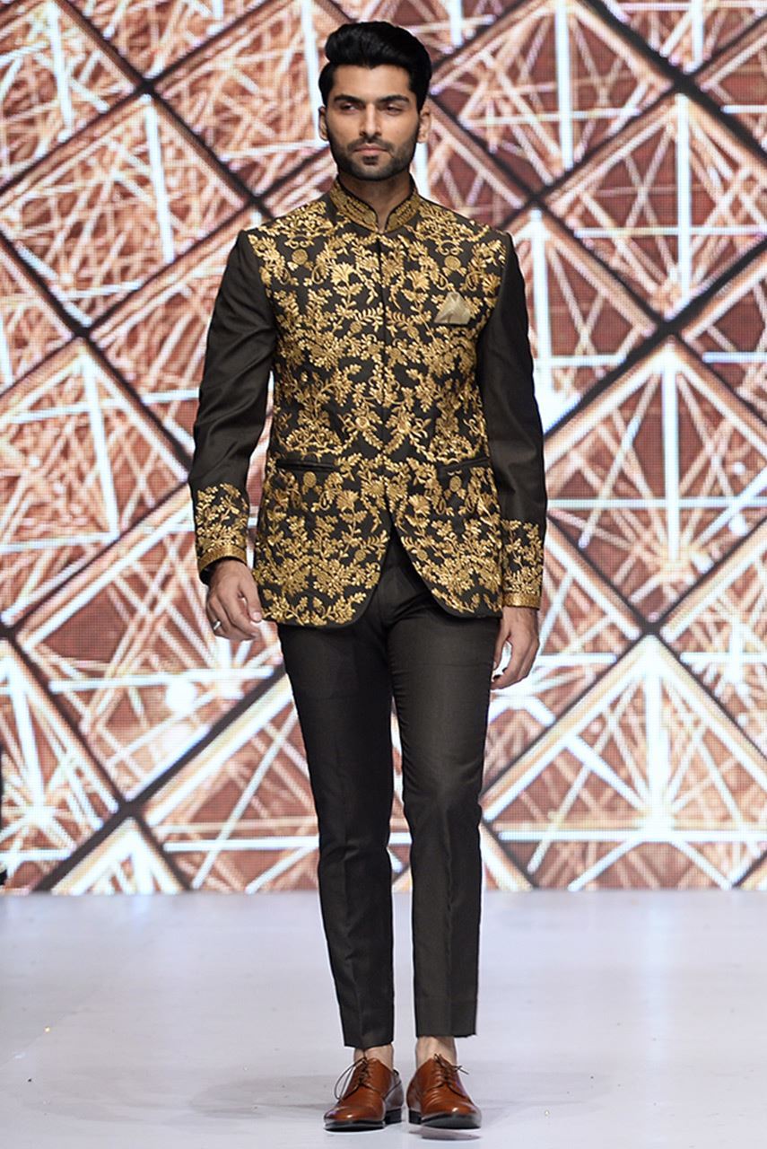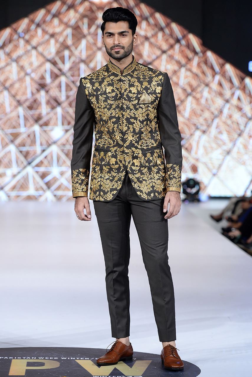 Dark mink grey jacket with gold embroidered front And sleeves styled with straight pants.