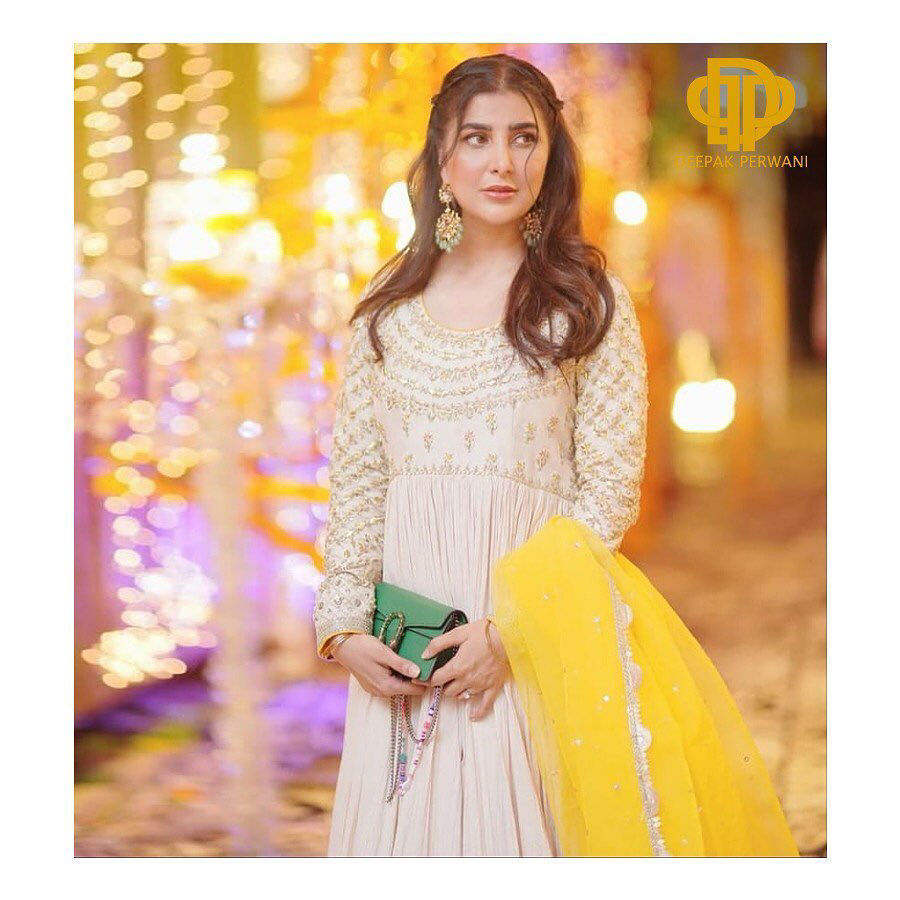 The oh-so-gorgeous Areeba Habib looking so very pretty in this bespoke ivory and yellow signature ensemble, perfect for the festive soirées.