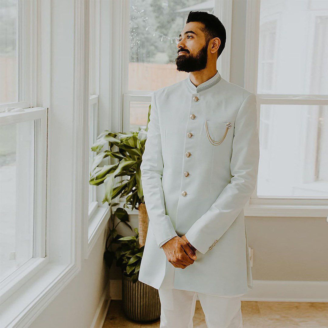Our client looks absolute dapper in this custom designed Sherwani by Deepak Perwani.