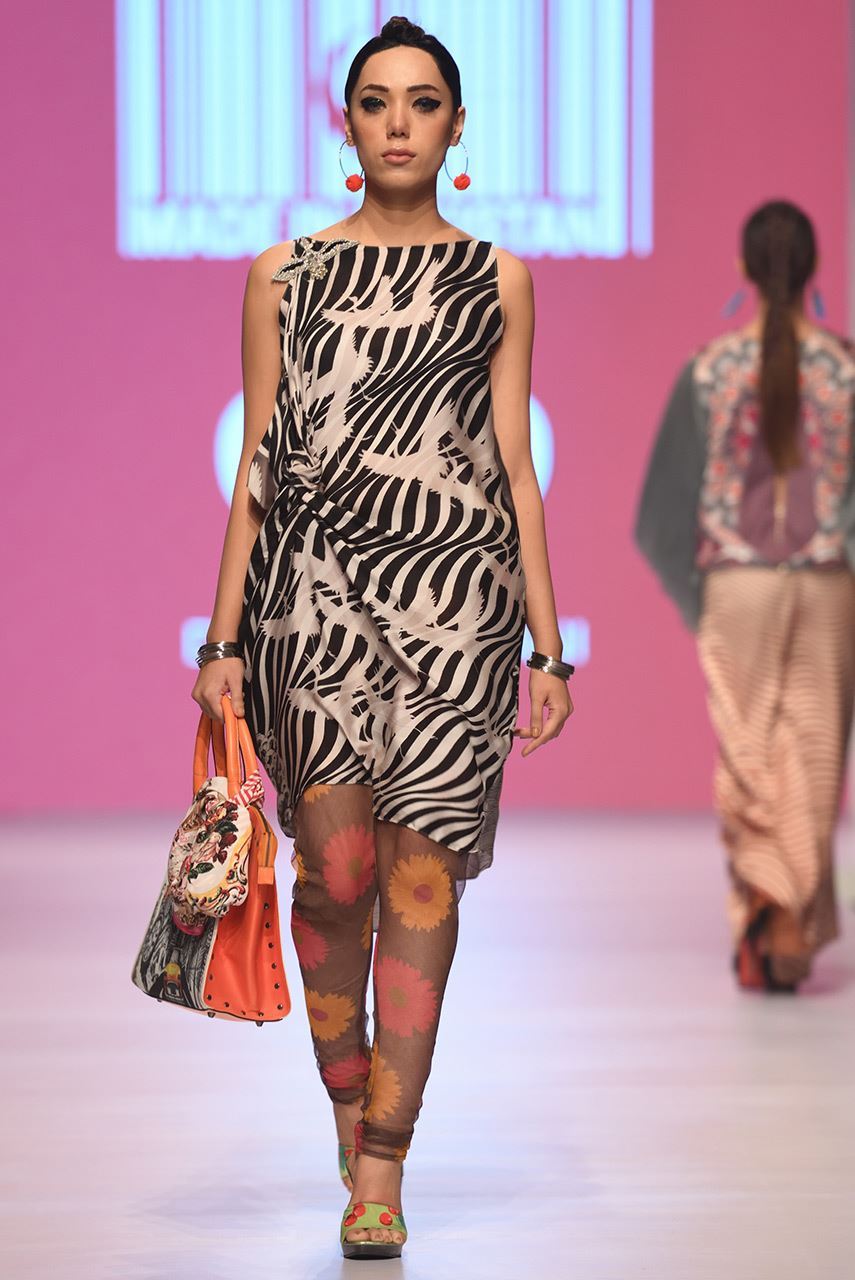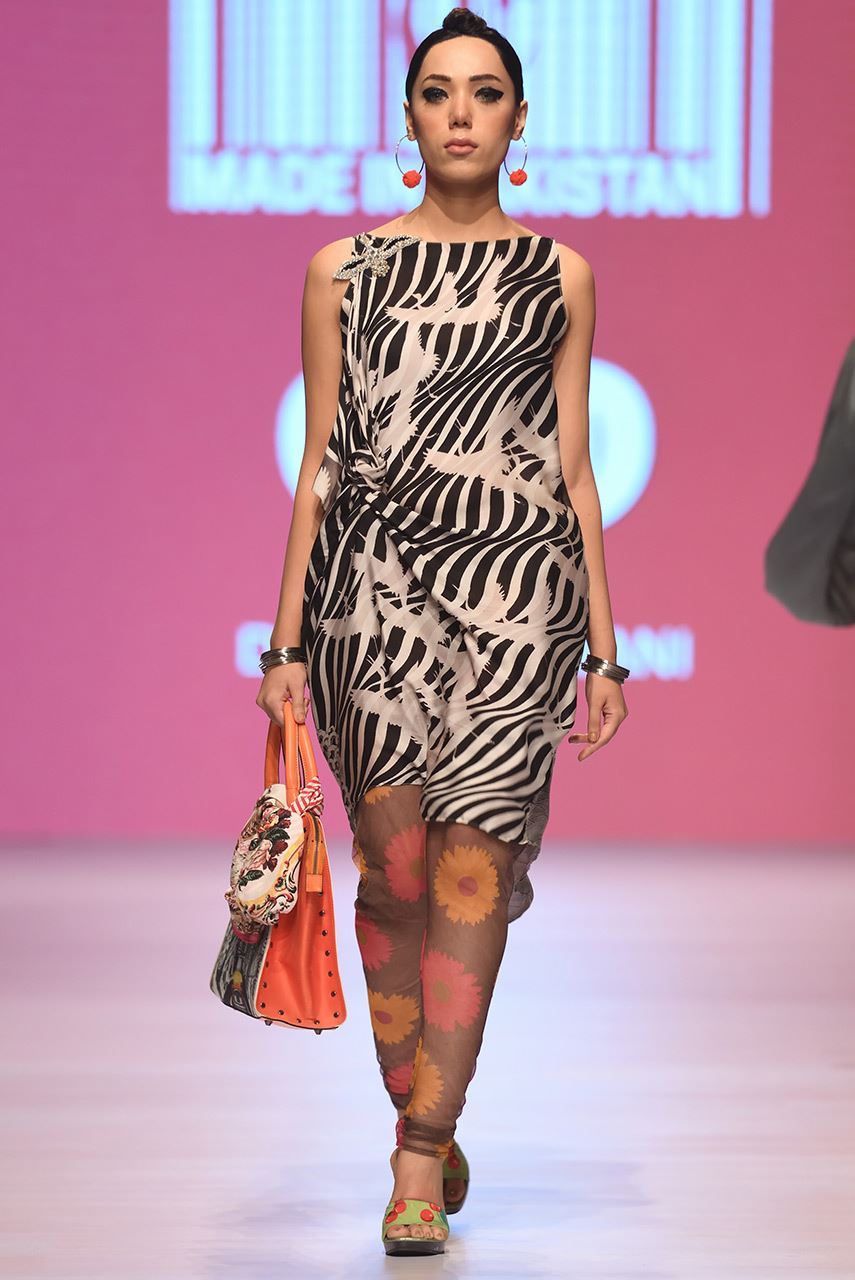 Draped asymmetrical dress in crepe-blend styled with printed net straight pants.