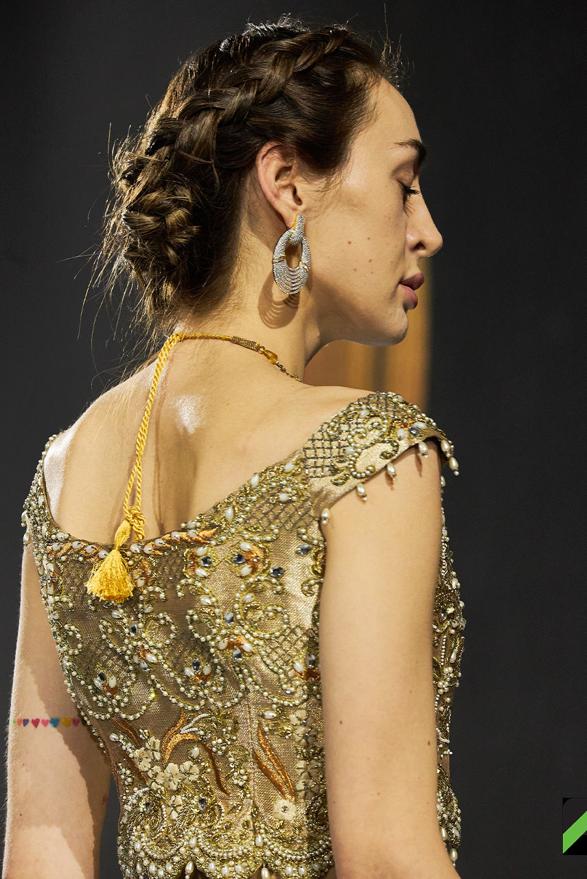 A beautifully draped shimmer silk skirt finished with a gold fringe. It is paired with a off-shoulder corset top in pure atlas fabric which is extensively hand worked in crystals and zardoze.
