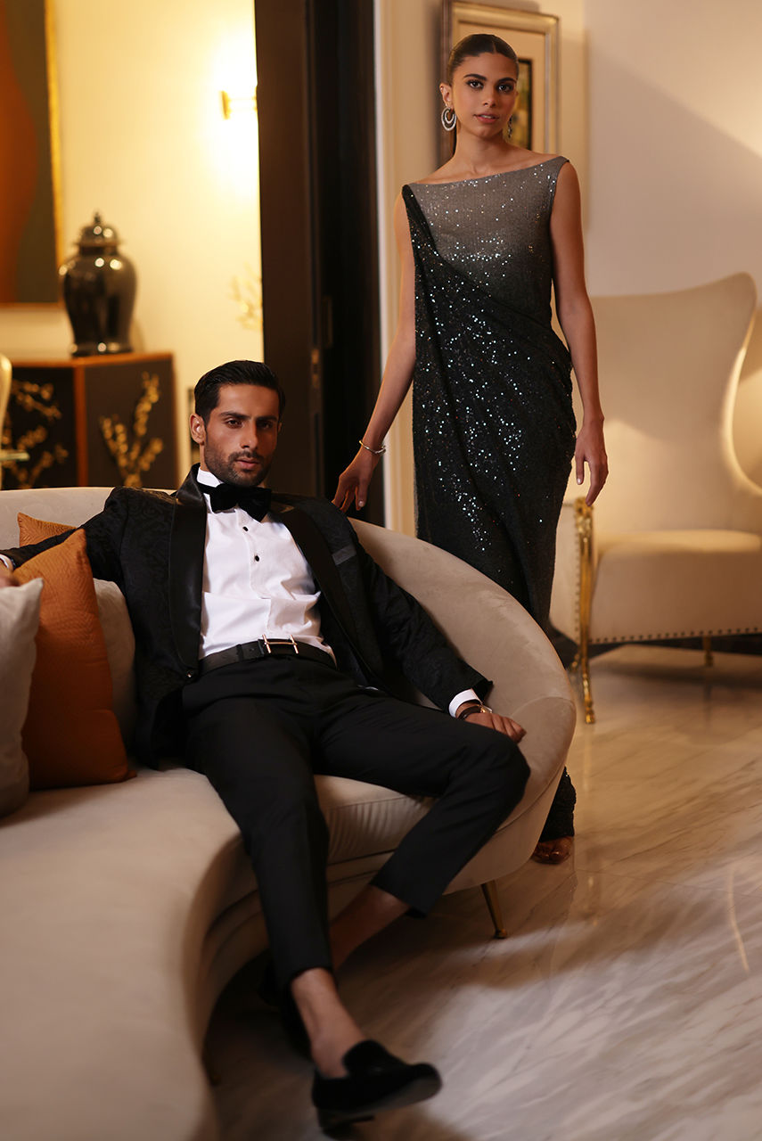 This shaded sequin drapped dress is a perfect example of premium cut and luxurious fabric. This makes a statement piece perfect for your next night out