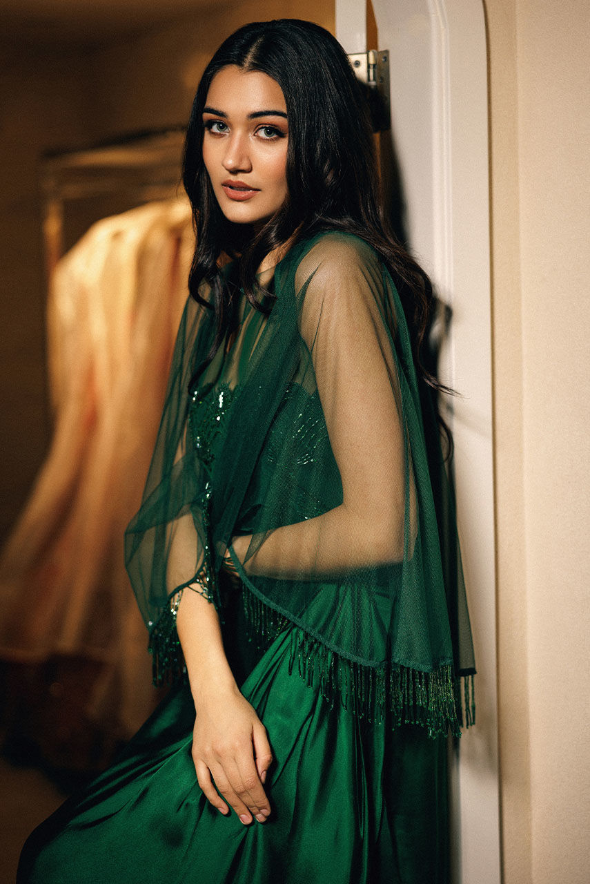 A beautifully draped silk skirt paired with a body suit in sheer French net elaborately hand embellished in crystals and beads. Styled with sheer net finished with a fringe.