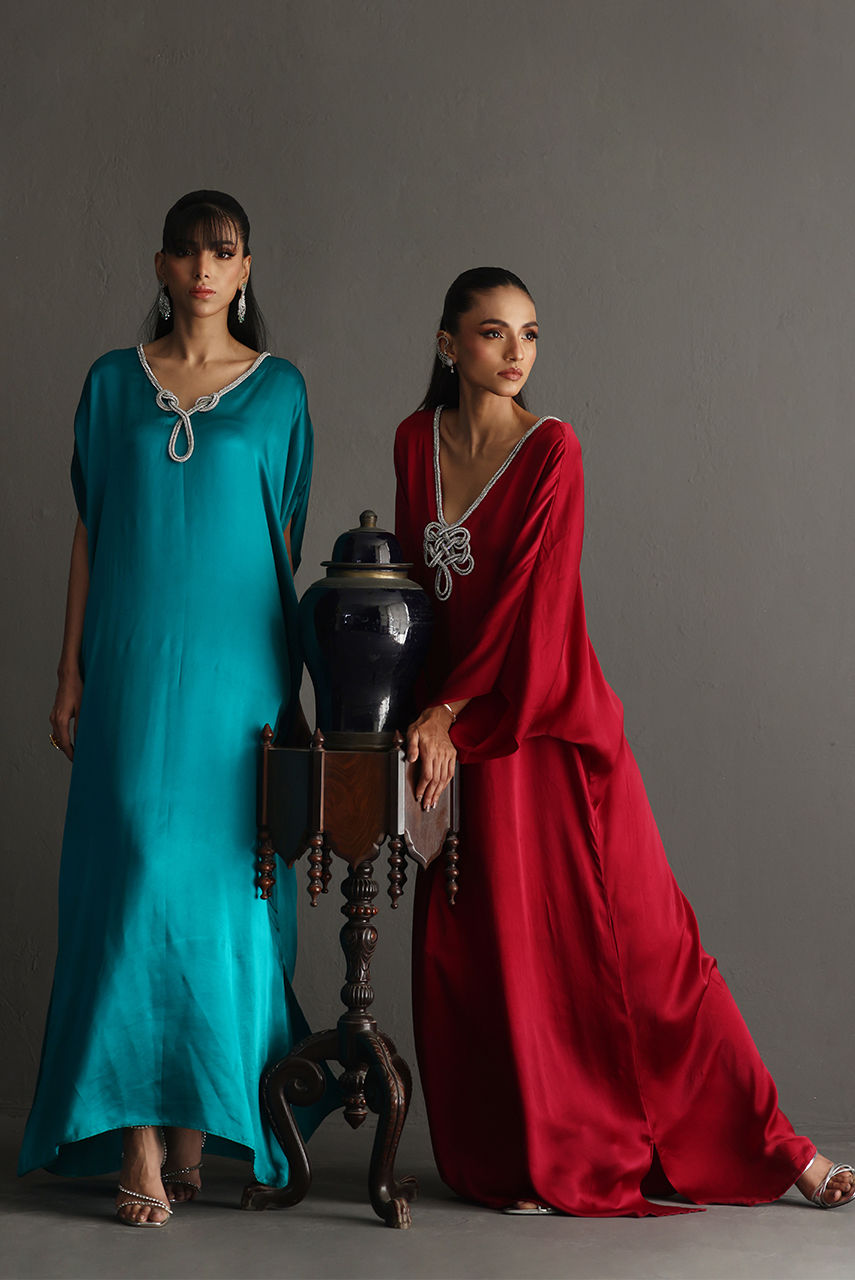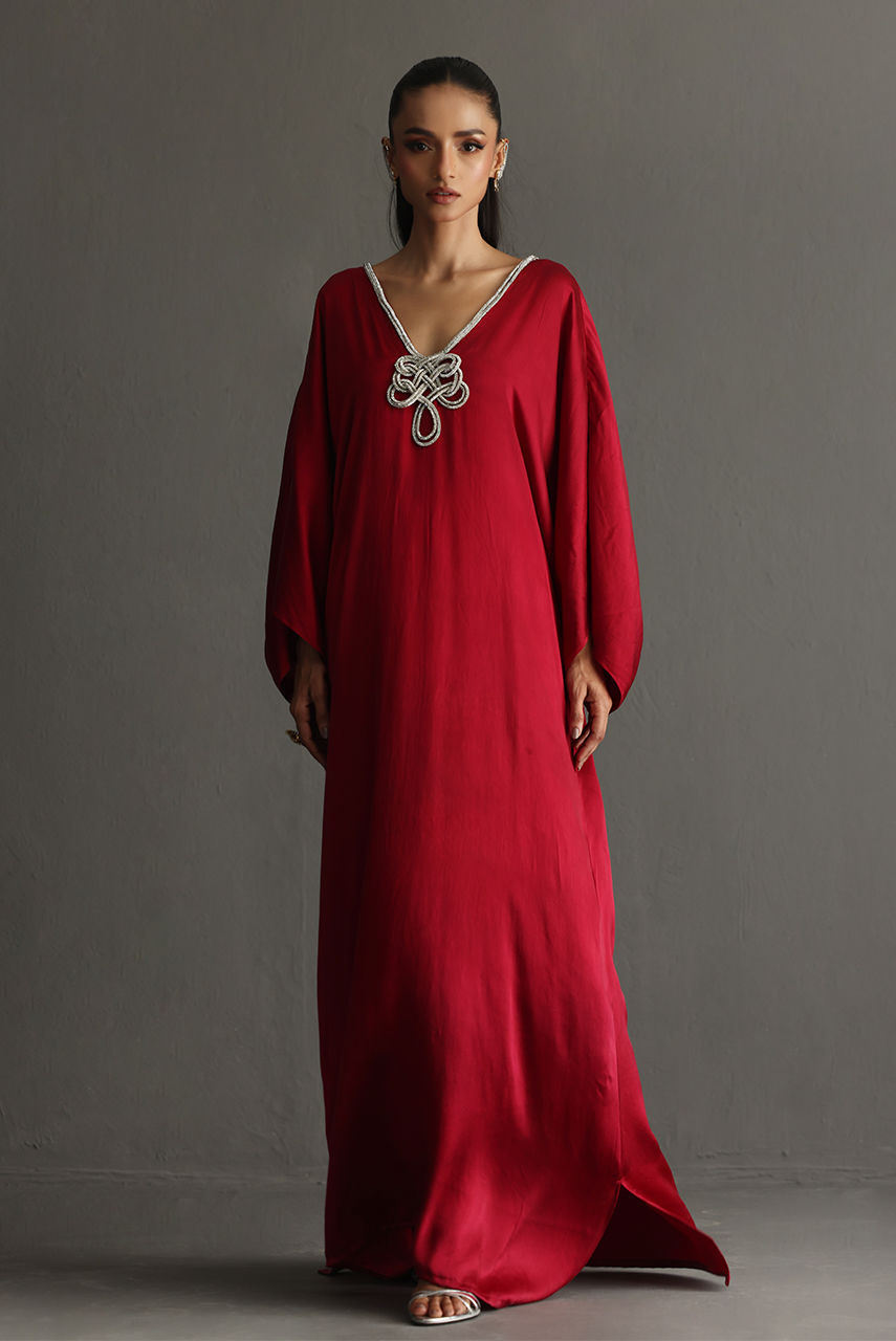 Wine rouge. Crafted from luscious pure Charmeuse this ethereal katfan is a statement piece. Featuring our signature diamonte hand crafted neck line this piece is perfect for any occasion.