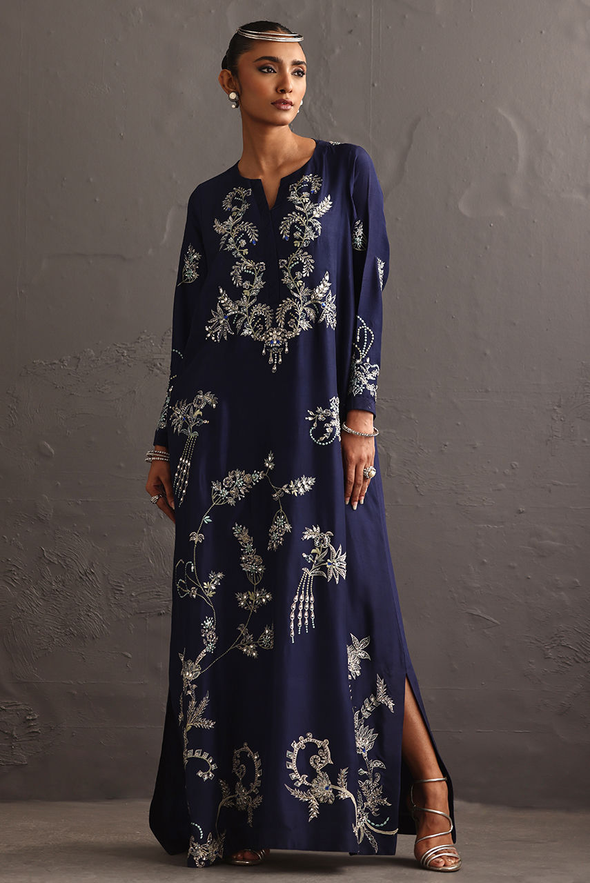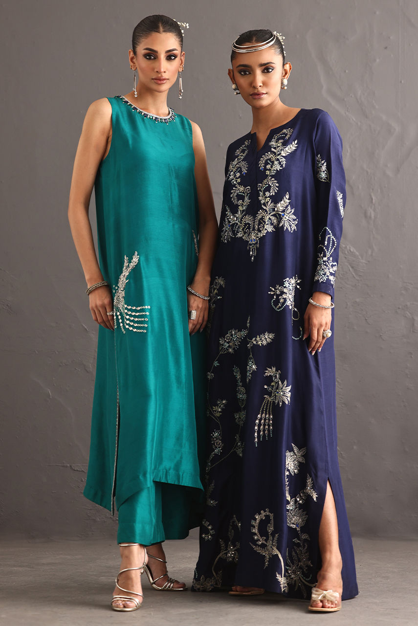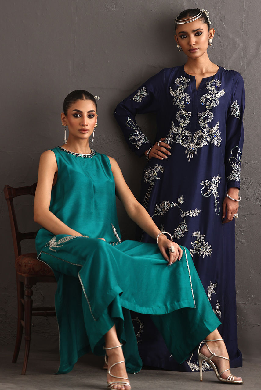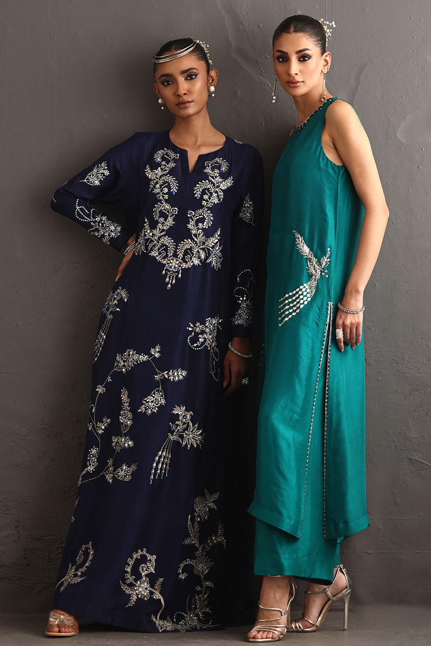 This pure raw silk piece explores the language of embellishment, drawing inspiration from the enduring beauty of jewel broaches. The long hand-embroidered shirt reimagines these brooches not as accessories, but as embroidered emblems. Featuring resham and crystal extensive hand work.