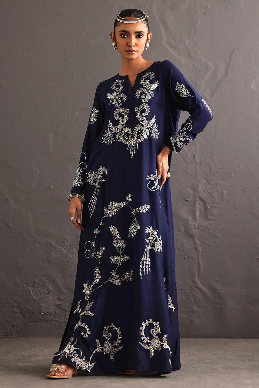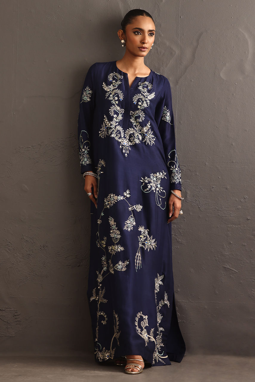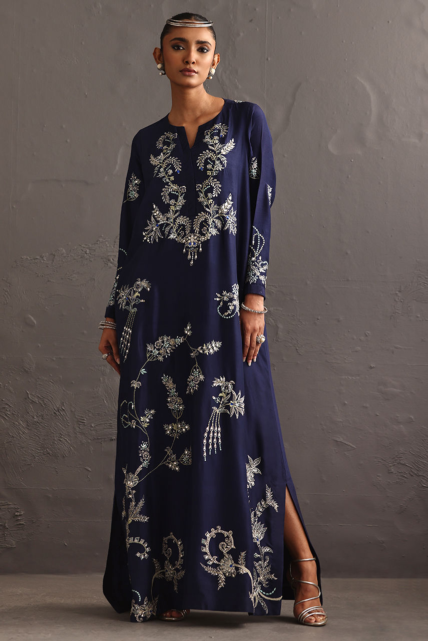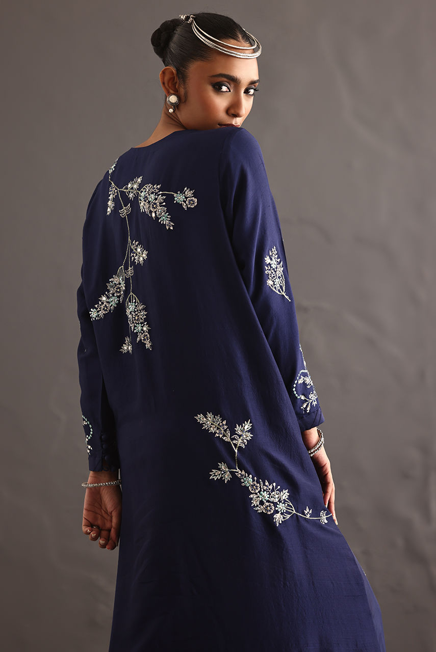 This pure raw silk piece explores the language of embellishment, drawing inspiration from the enduring beauty of jewel broaches. The long hand-embroidered shirt reimagines these brooches not as accessories, but as embroidered emblems. Featuring resham and crystal extensive hand work.