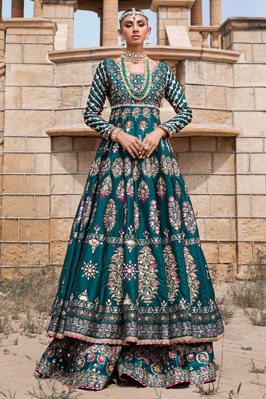 This is an Indian raw silk dress in deep blueish olive green, with a touch of red in its edging giving off an essence of our bride's love to stand out and break the measures. With this, strikingly embellished elegant dress with zardozi, resham and stones she wants to acknowledge her individuality and has full confidence in pulling off any dress she wears. Also, this organza dupatta is uplifting all the look with it's embellished border with red pati and makes our bride ready to meet the world