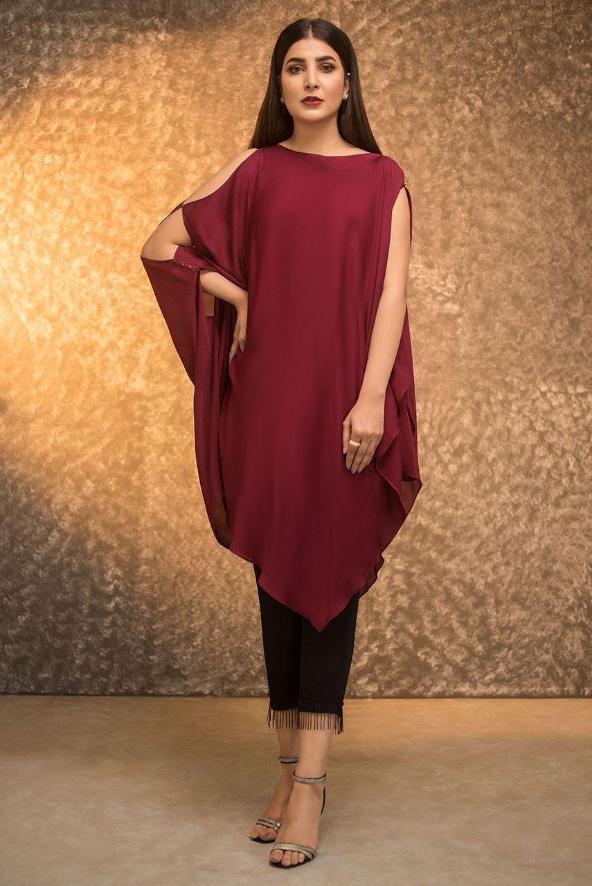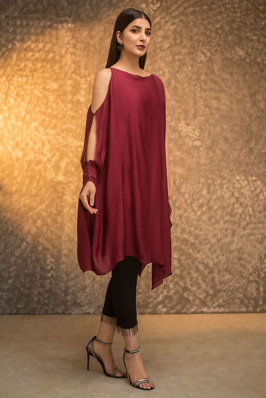 A crepe silk bias top with stud detail on sleeves slit.