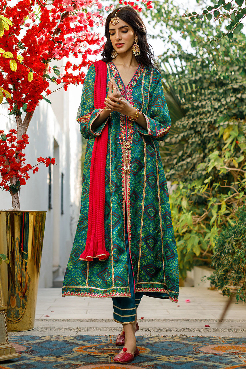A green chunri kaalidar with zari and Resham embroidery with handmade tassel paired with silk trouser with lace and a crushed dupatta.