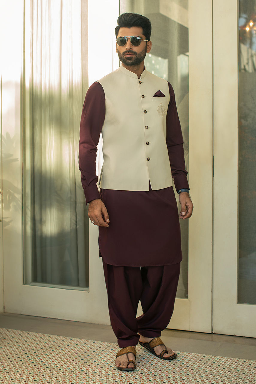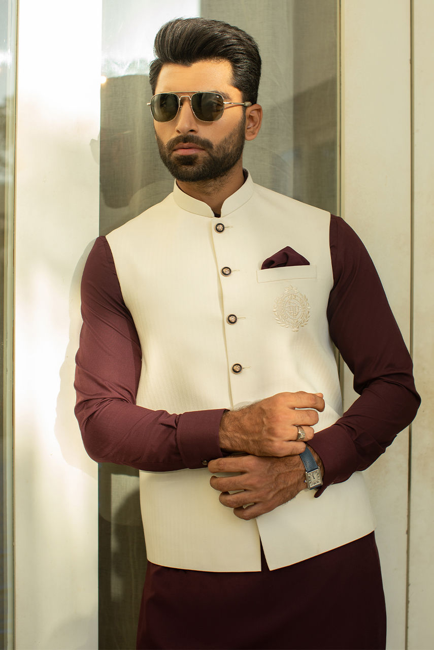 An off-white suiting waist coat with DP embroidered logo