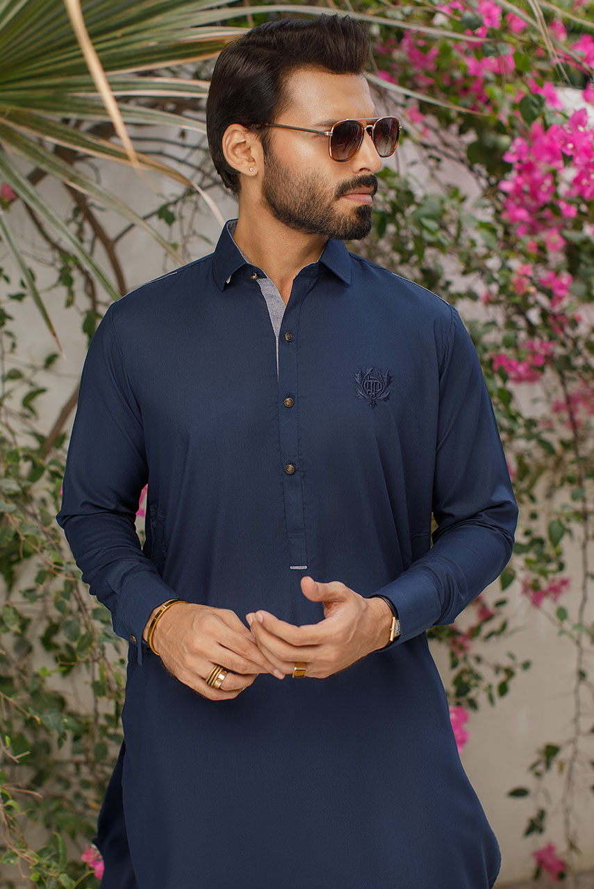 A blue suiting waist coat with button detailing and embroidered DP logo