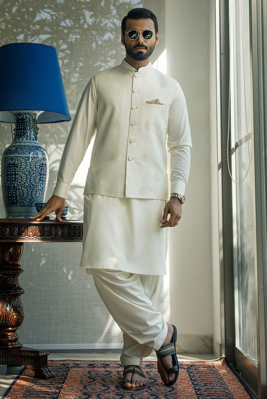 A Off white raw silk waist coat with embroidered motifs Paired with a Boski Wash and Wear kurta shalwar with detailing on collar and cuffs.