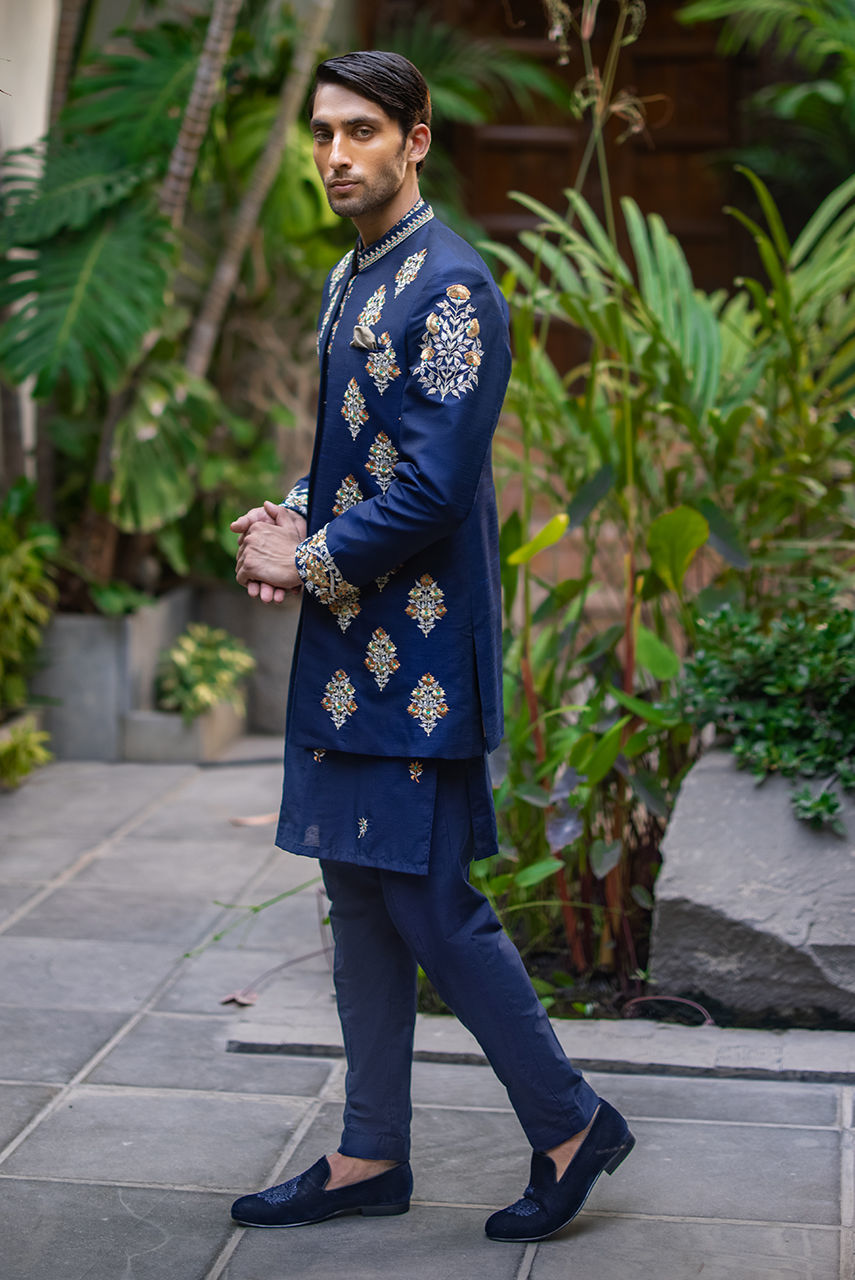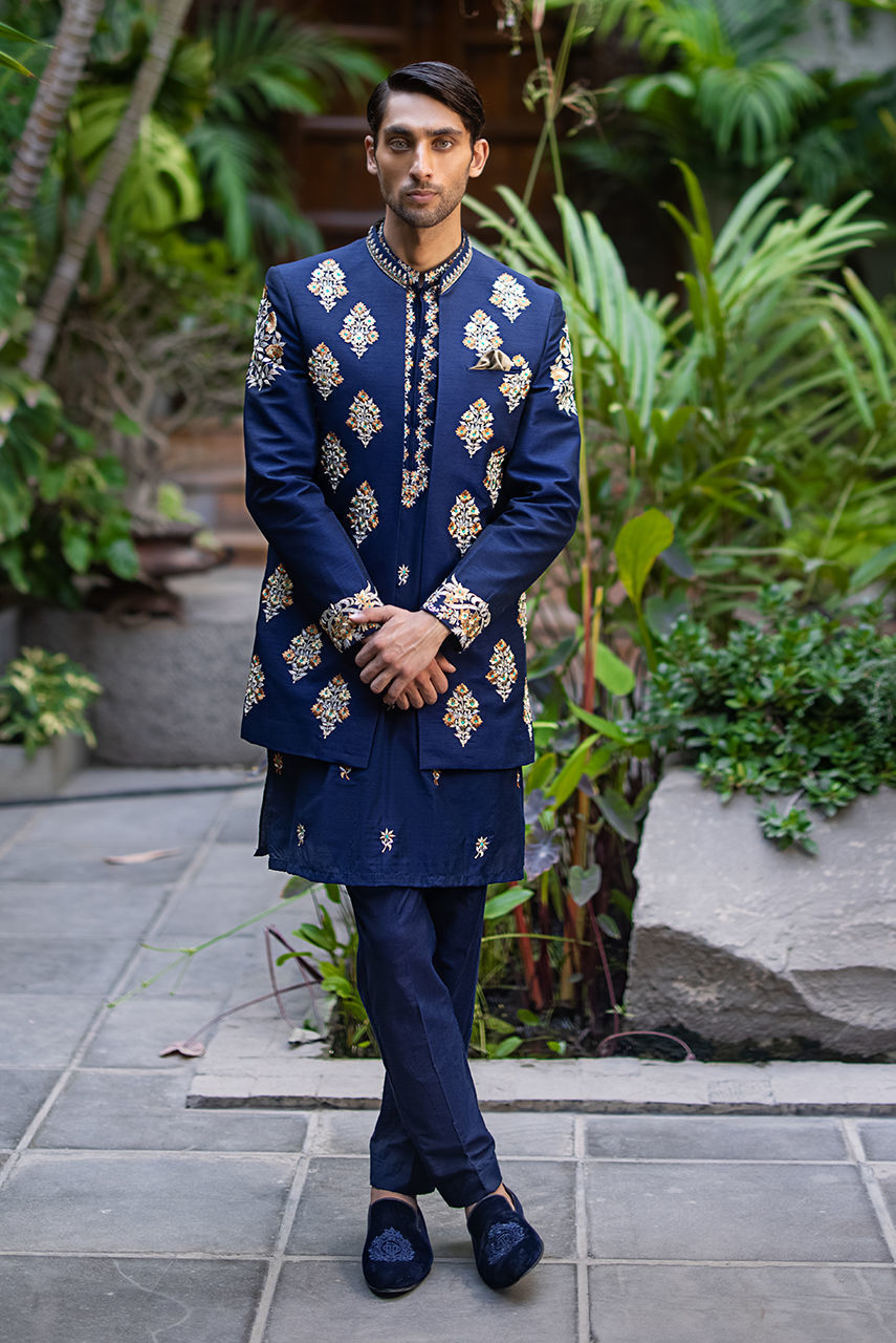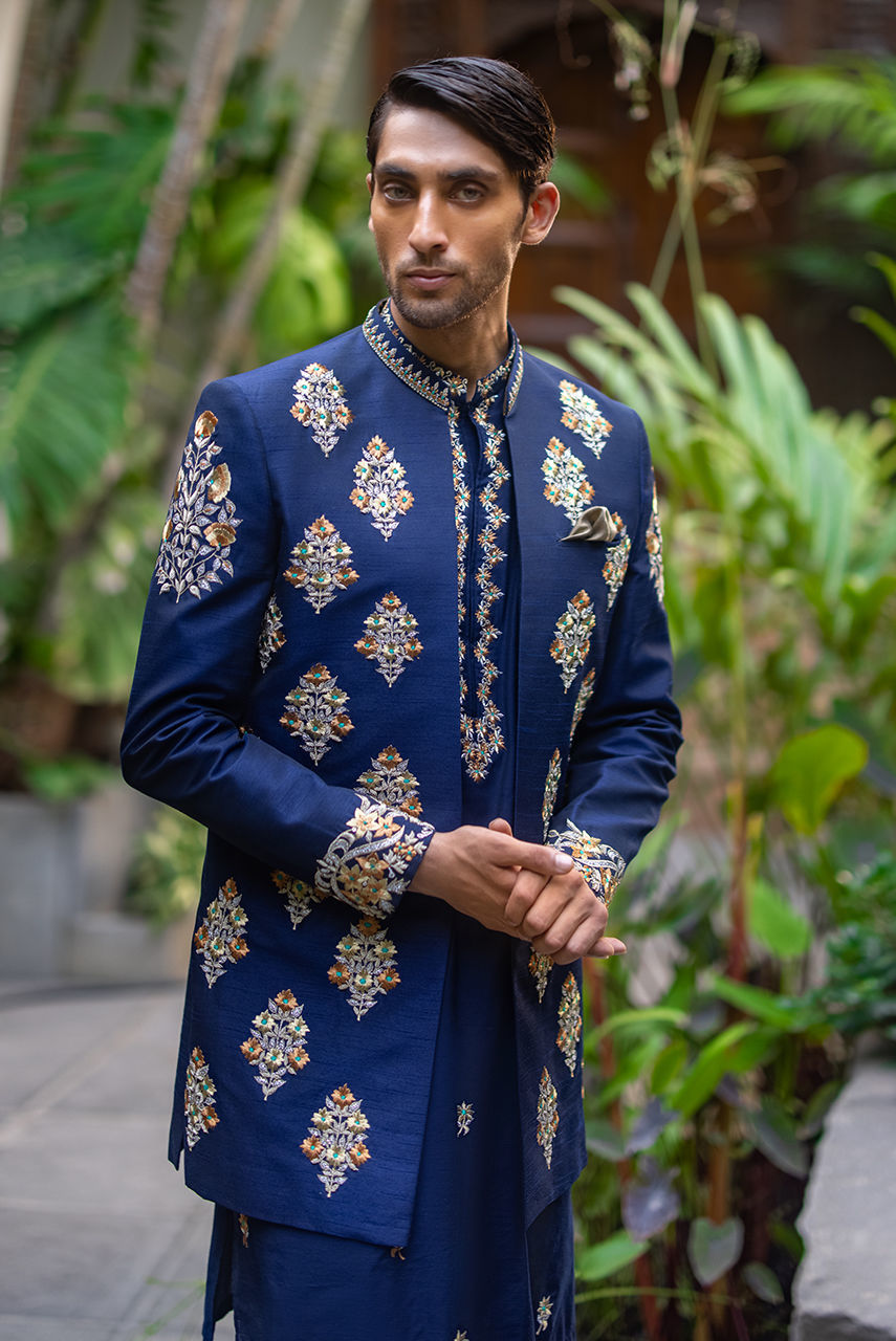 Step into the realm of elegance with our blue raw silk jacket, exquisitely adorned with intricate korra, resham and hand embroidery. Paired with a matching blue embroidered kurta pajama, this ensemble exudes sophistication and style. Perfect for formal occasions, weddings, or festive celebrations, this outfit is a testament to refined taste and timeless charm. Make a statement with this impeccably crafted ensemble that effortlessly blends tradition with contemporary fashion