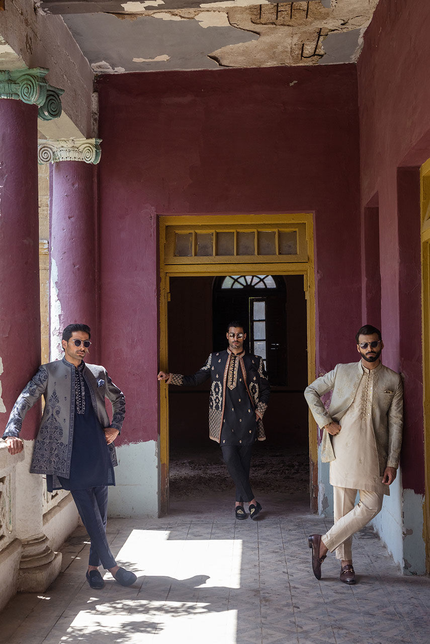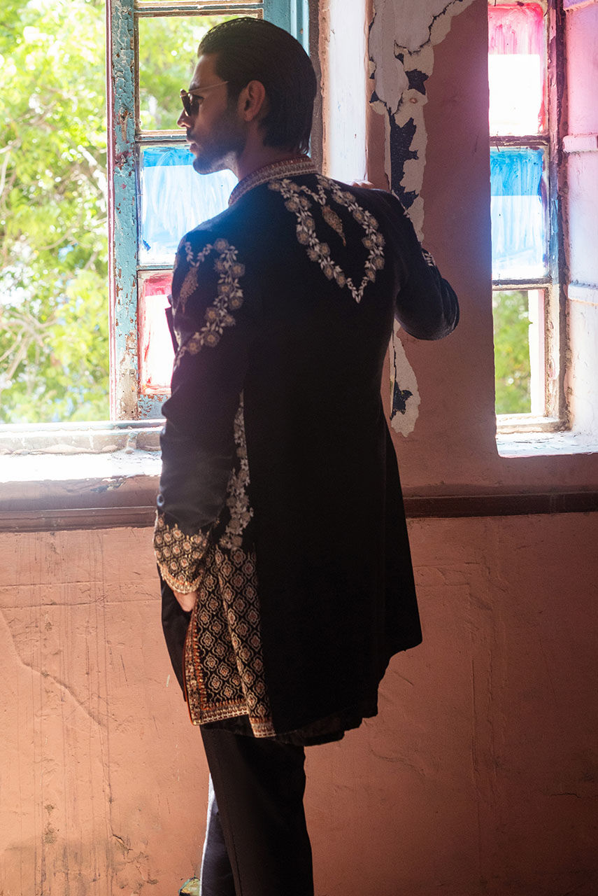 Step into the realm of elegance with our black raw silk jacket, exquisitely adorned with intricate embroidery. Paired with a matching black embroidered kurta pajama, this ensemble exudes sophistication and style. Perfect for formal occasions, weddings, or festive celebrations, this outfit is a testament to refined taste and timeless charm. Make a statement with this impeccably crafted ensemble that effortlessly blends tradition with contemporary fashion.
