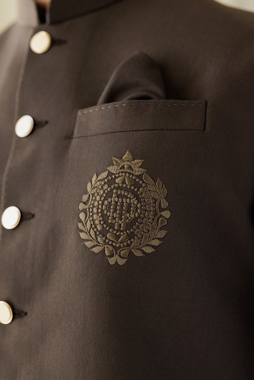 Dark brown suiting waist coat with crafted buttons thread work detailing and iconic DP logo.
