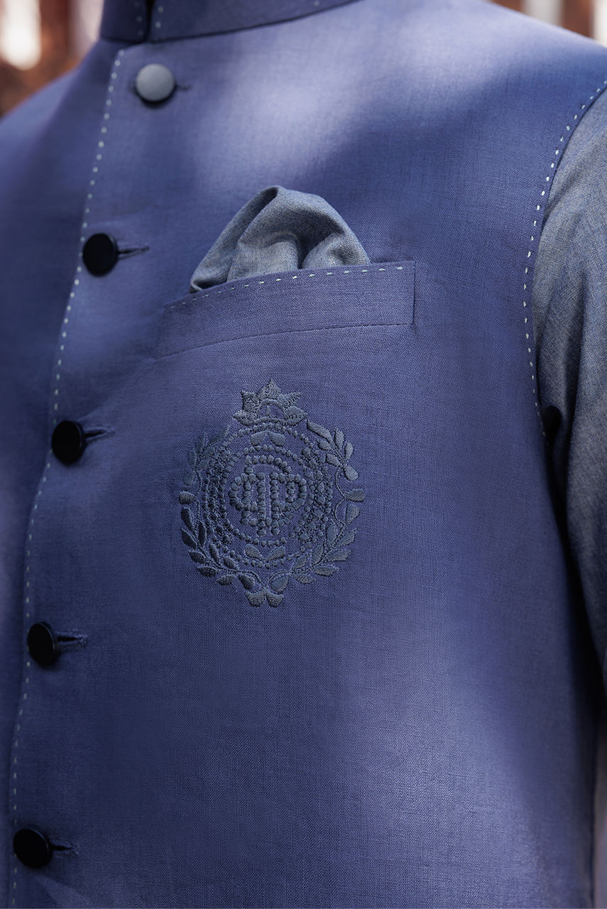 Light blue linen waist coat with the iconic DP logo and crafted buttons.