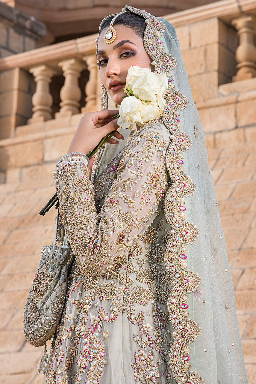 On the wedding day, our bride wants something which can relate to her devotion of heart and her spirit of soul something that brings more light out of her. This is a beautifully embellished mint blue organza dress having decorated motifs of buds and vines in the materials of traditional embroidery such as resham, zardozi, and stones. The crushed fabric with pleated organza circles under the dress gives off more volume and length to the figure. This bride is not urging additional attention she knows who she is and she shines brightly like a diamond.
