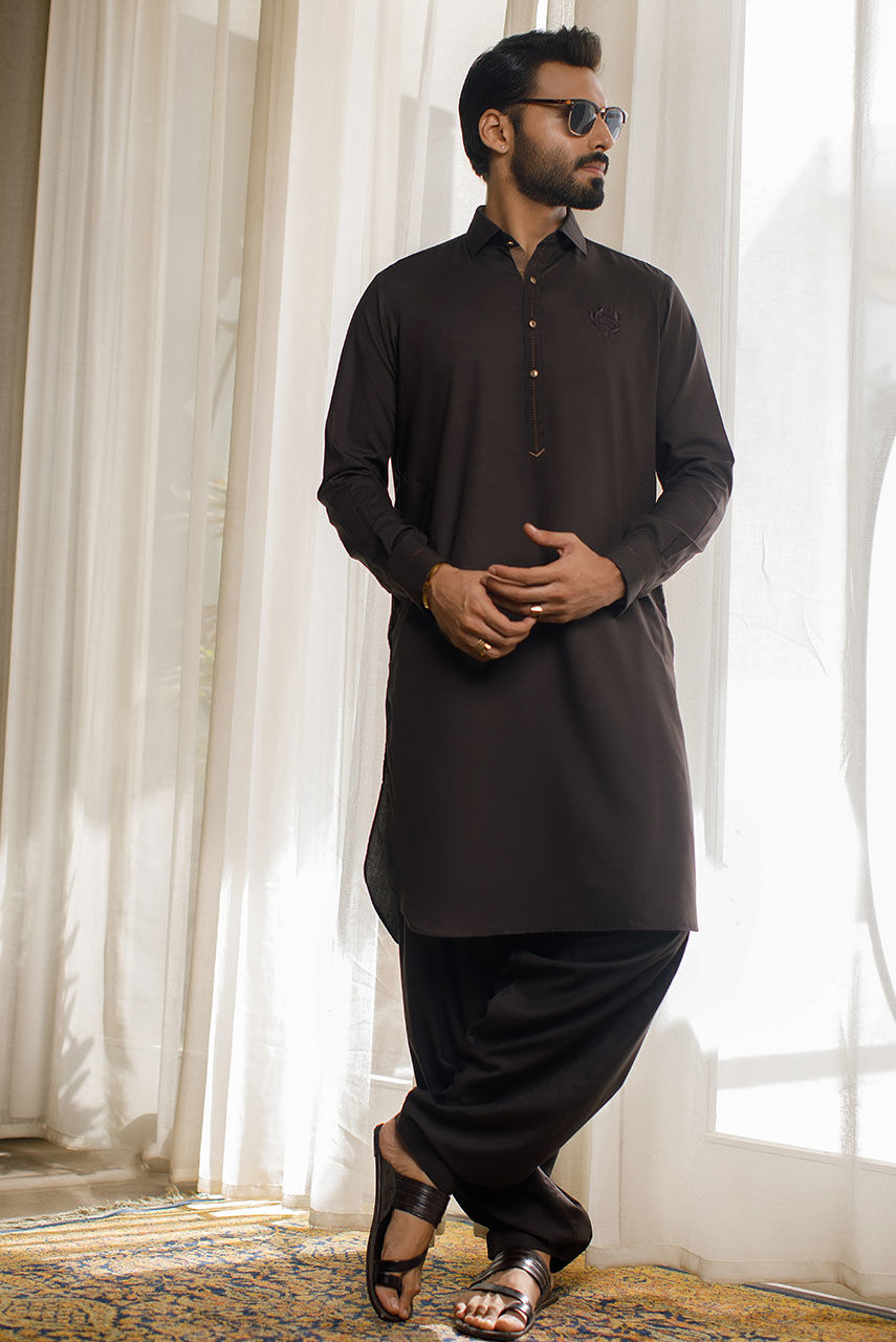 A brown boski linen kurta shalwar with thread work detailing and buttons and an embroidered DP logo.