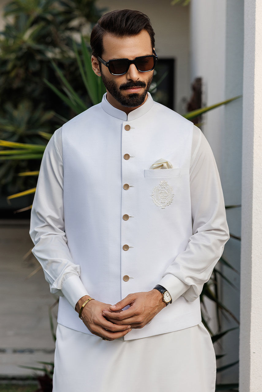 This white Boski linen kurta shalwar exudes timeless elegance, enhanced by its meticulously crafted buttons.