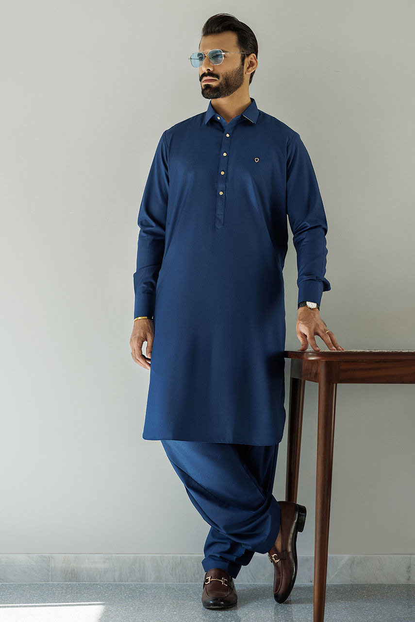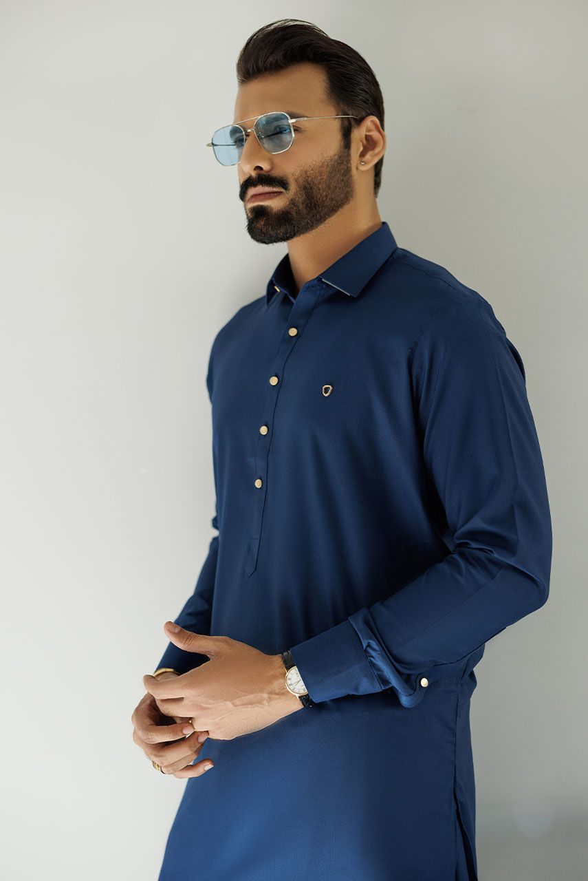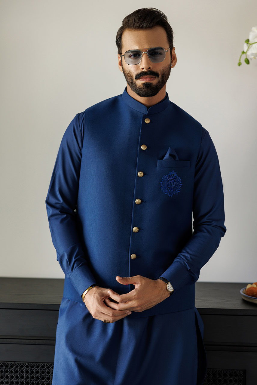 This navy blue Boski linen garment is a testament to refined craftsmanship, accentuated by its metal buttons and intricate DP detailing.