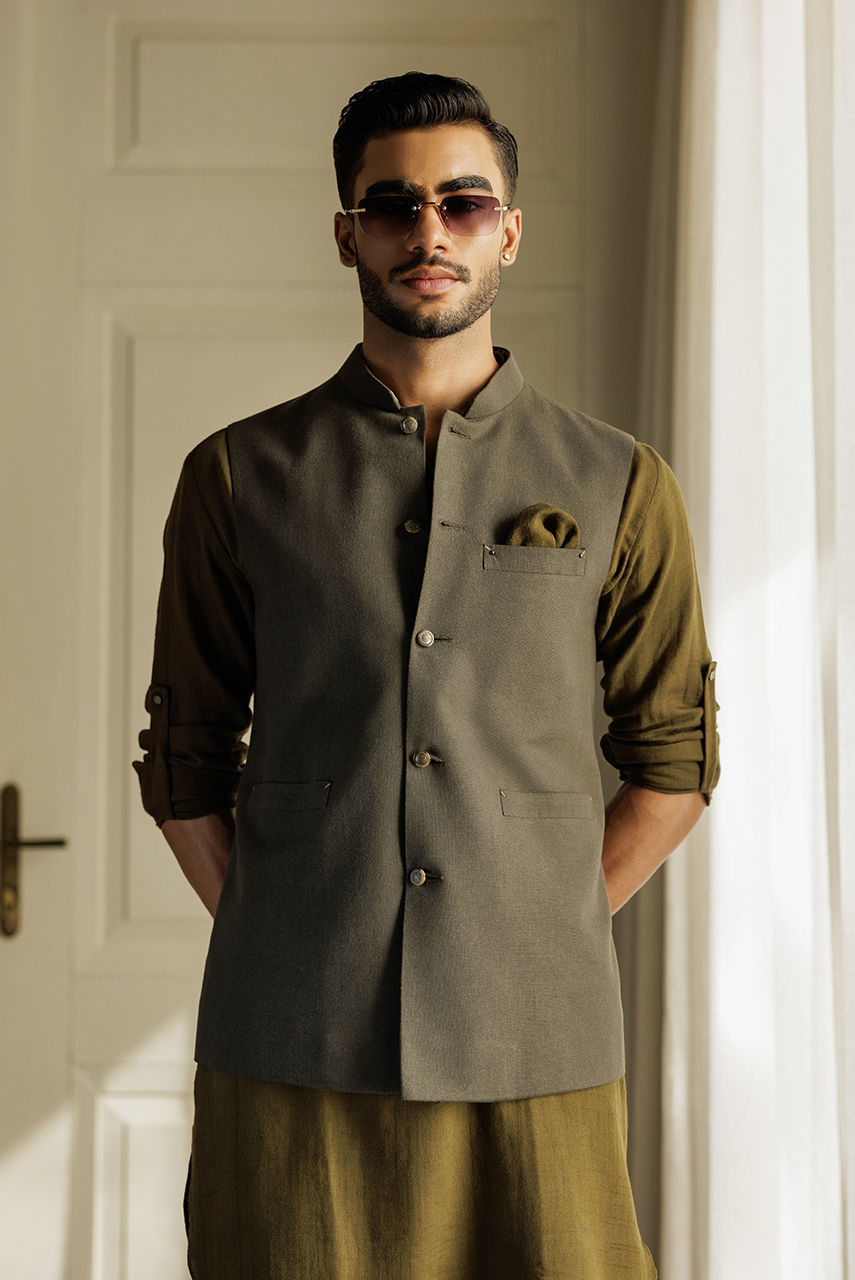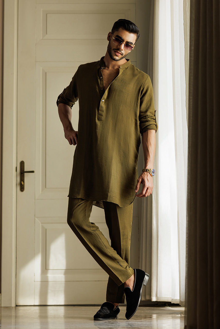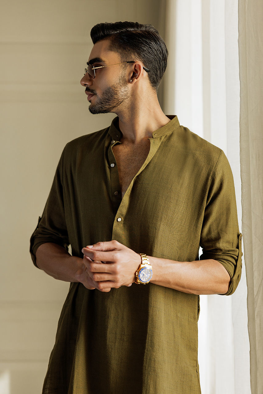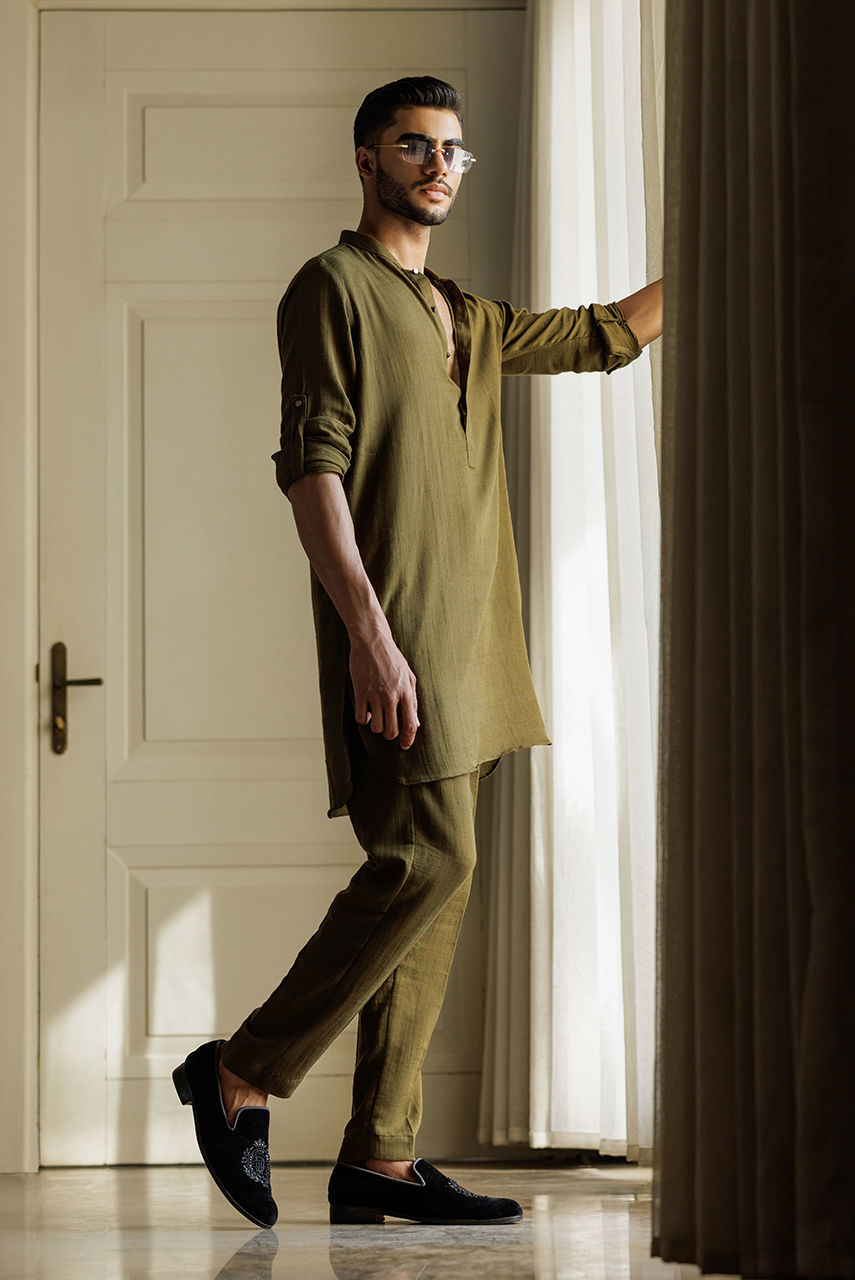 A green medium length linen kurta pajama with button detailing paired with a pajama.