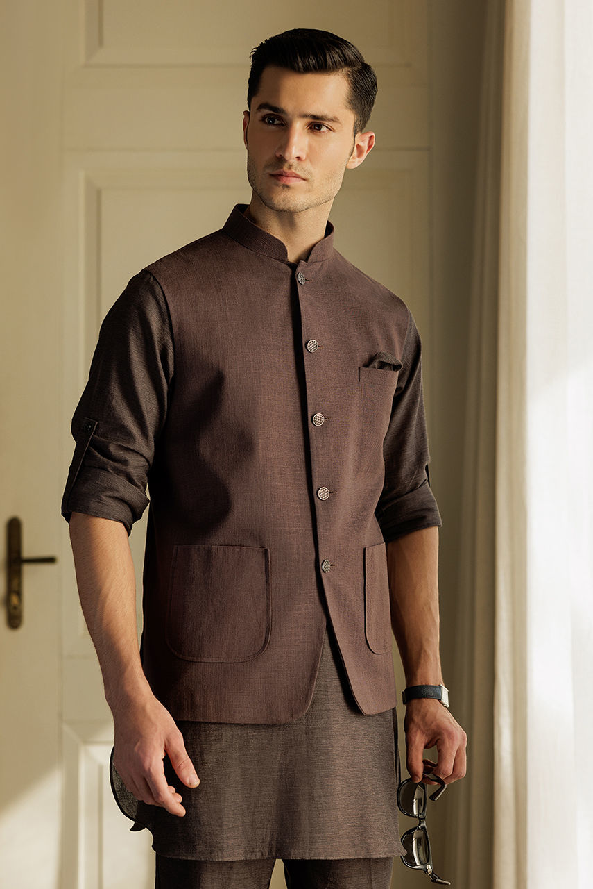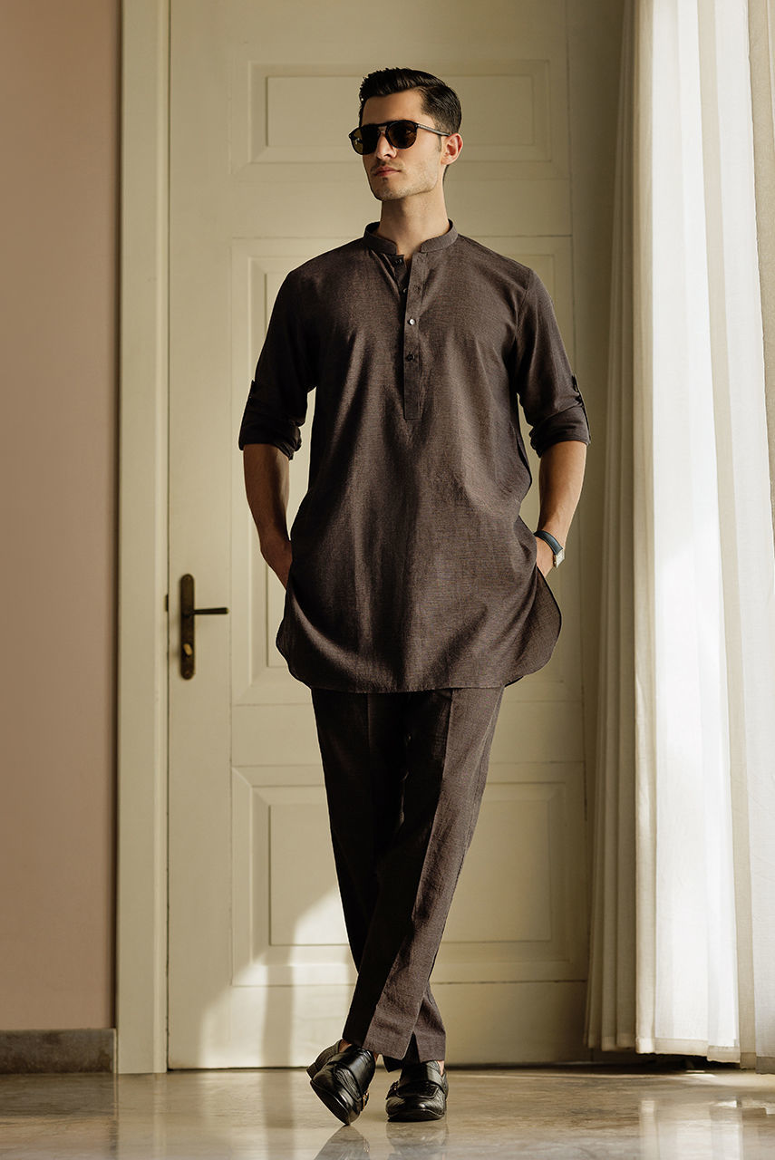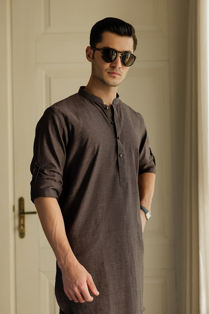 A dark greyish medium length linen kurta pajama with button detailing paired with a pajama.
