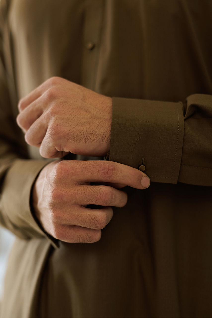 Brown boski linen kurta shalwar with button, thread wok and stitching detail.
