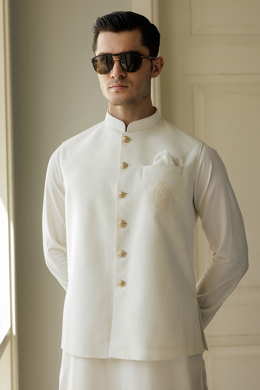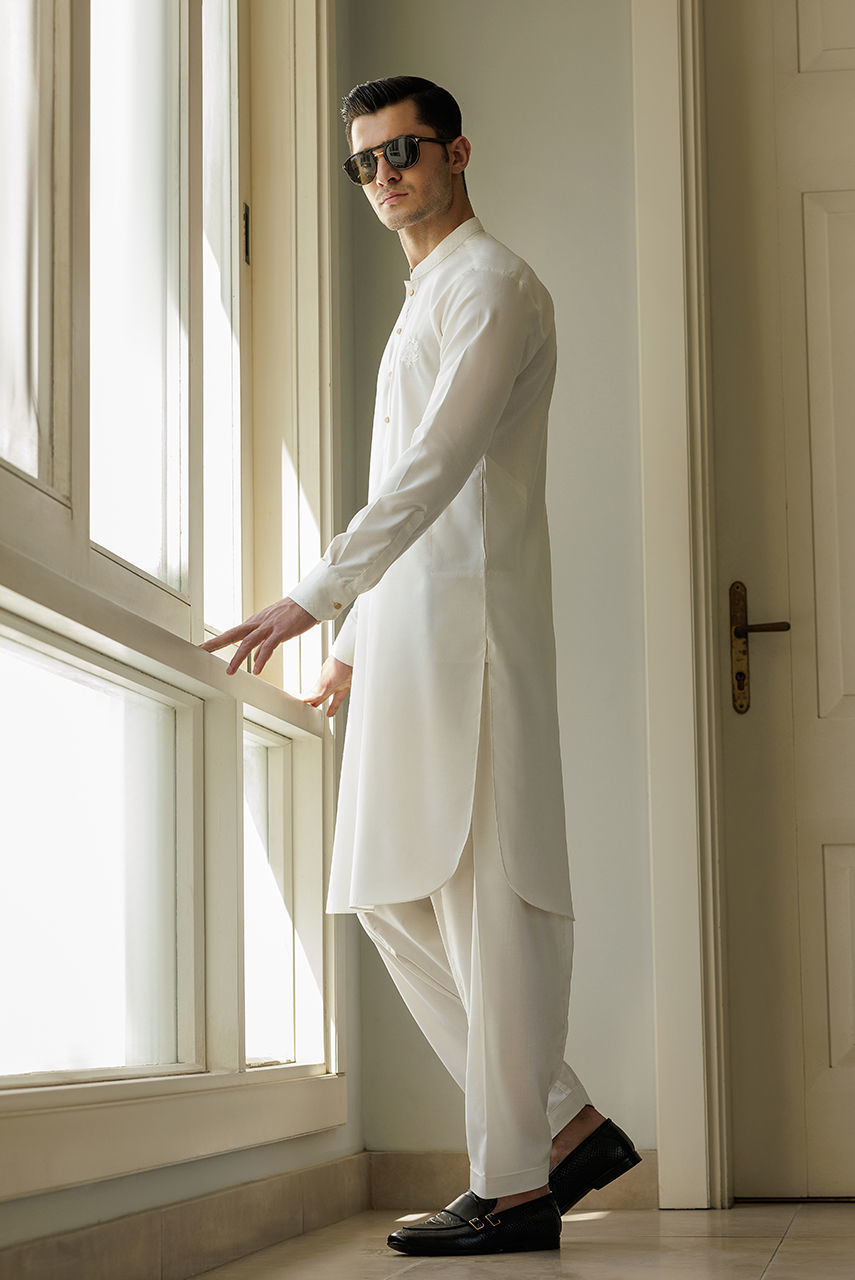 White boski Linen kurta shalwar with metal button and detailing on the cuff with DP logo.