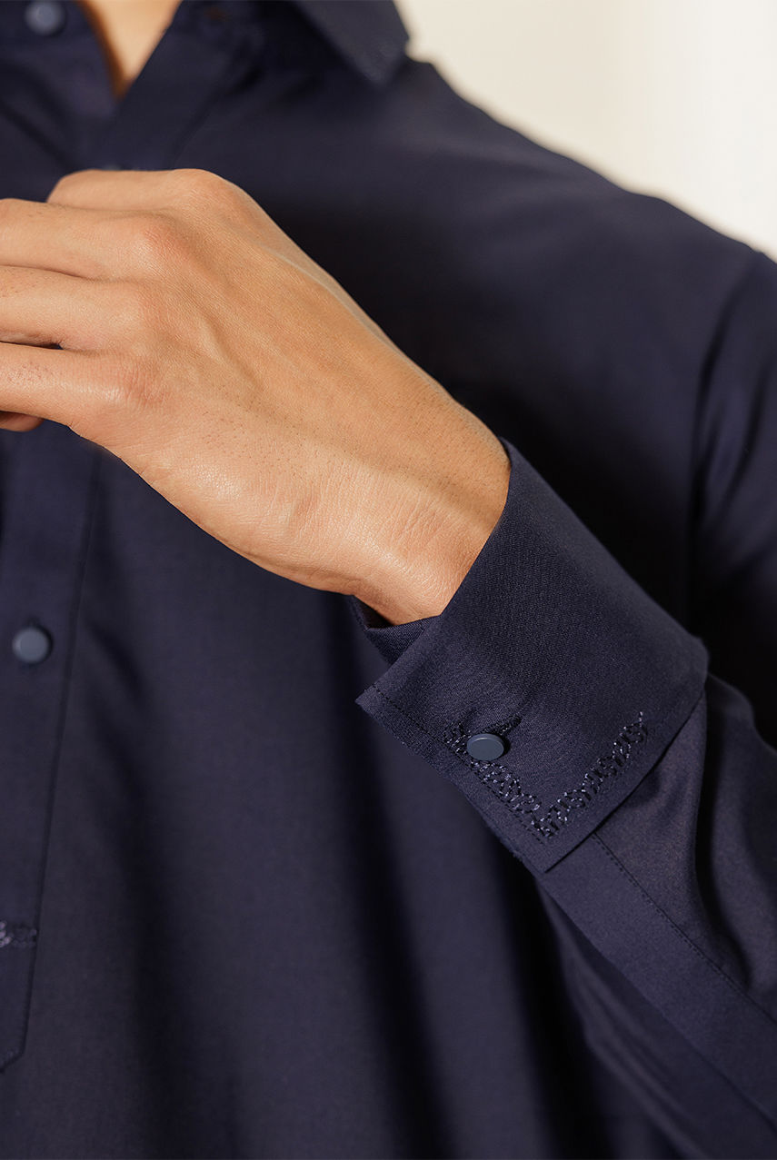 Blue boski linen kurta shalwar with button, thread work and stitching detail.