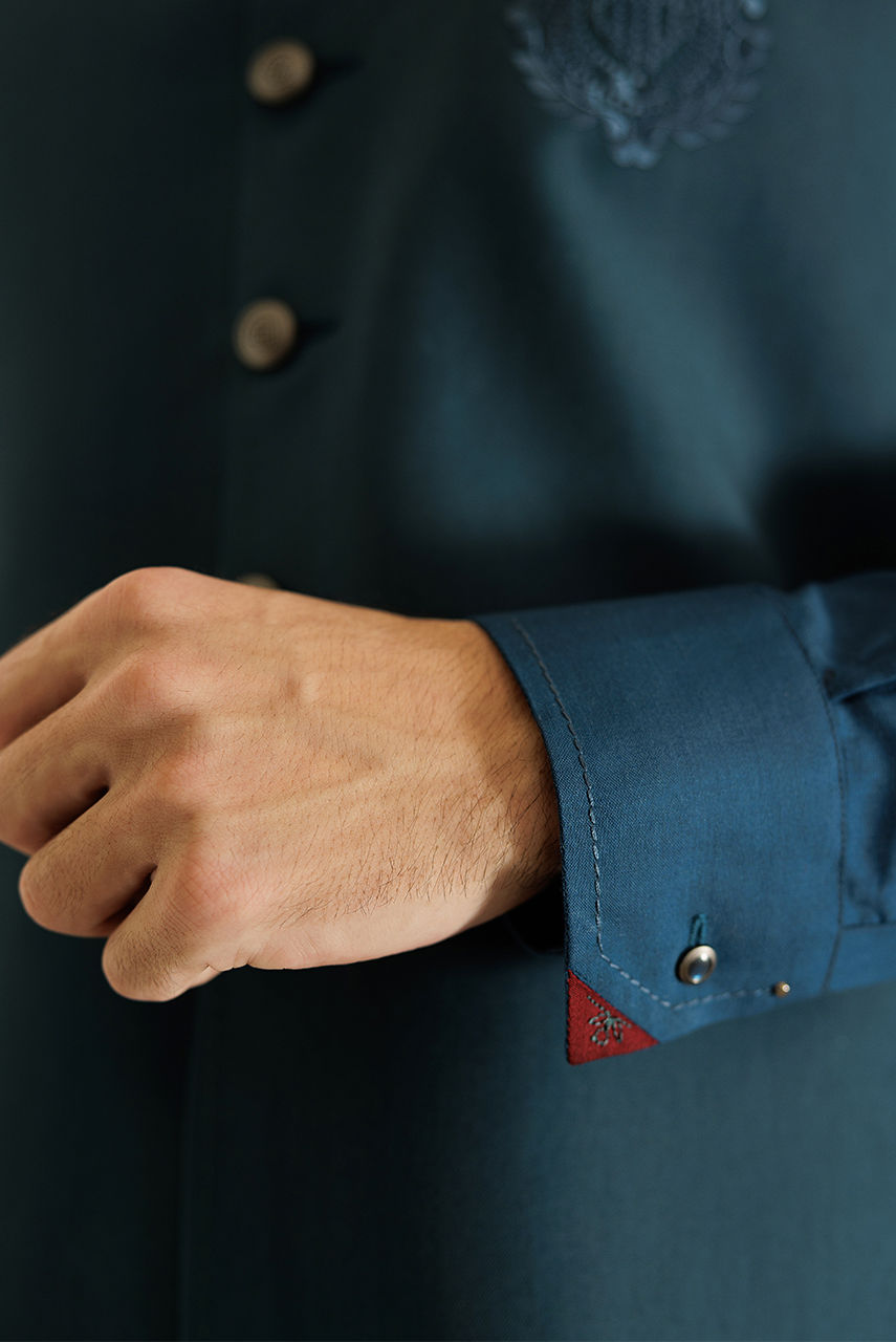 Navy blue boski linen kurta shalwar with button, thread wok and stitching detail.