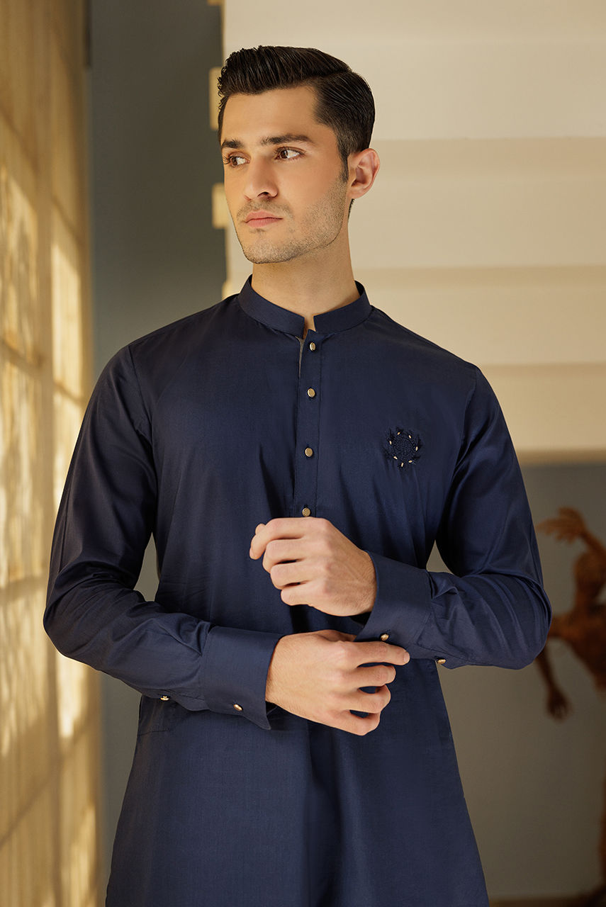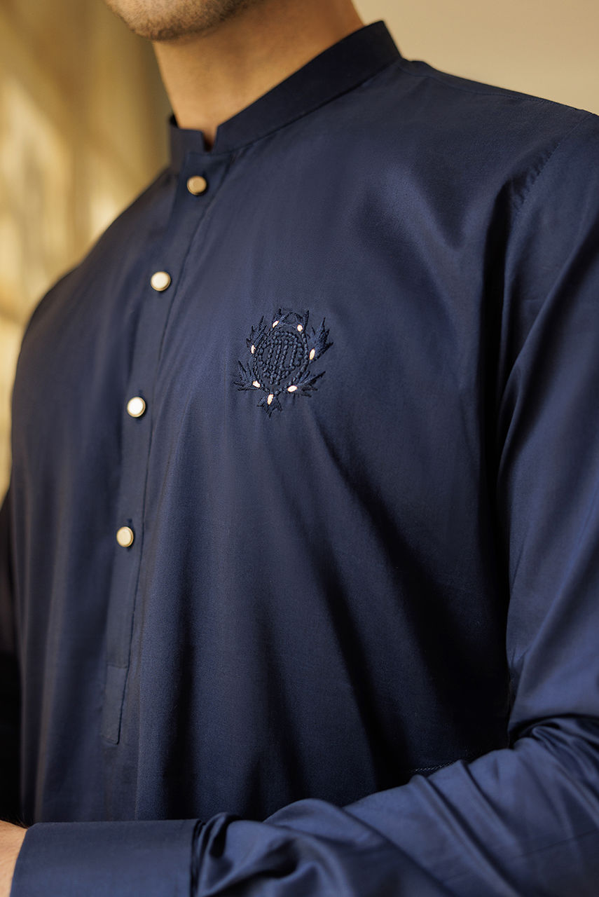 Blue cotton Kurta shalwar with metal button and detailing on the cuff with DP logo.