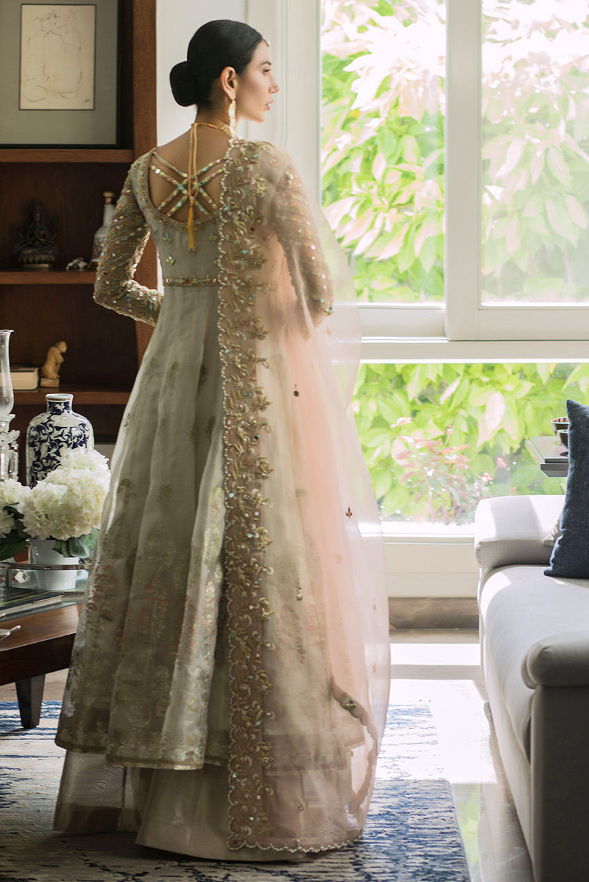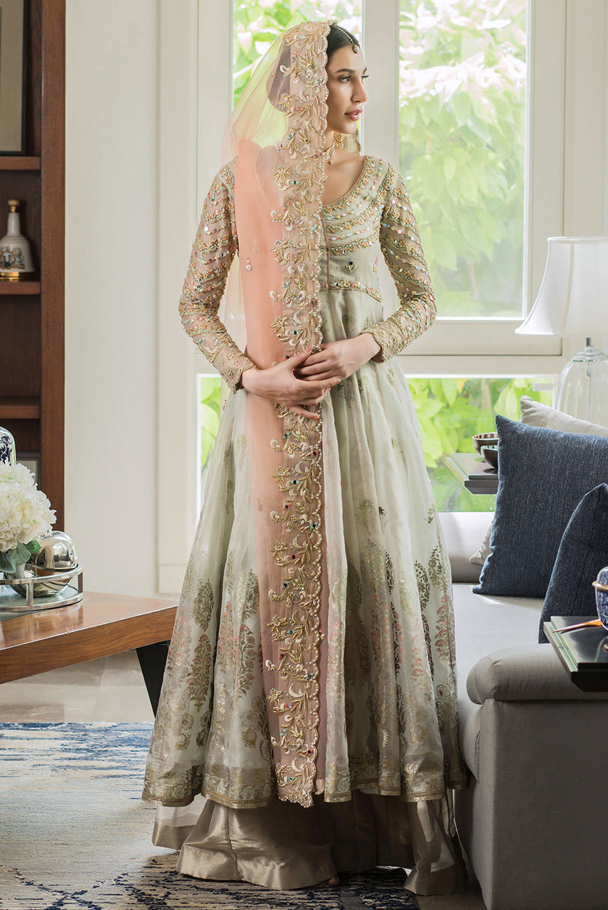 A maisori long anarkali hand screen printed and heavily embroidery with resham, zardozi and mirror work. It comes with an organza dupatta with a heavy matha Patti and scallop all around embroidered in zardozi resham and mirror work. It comes with a l'ame gharara