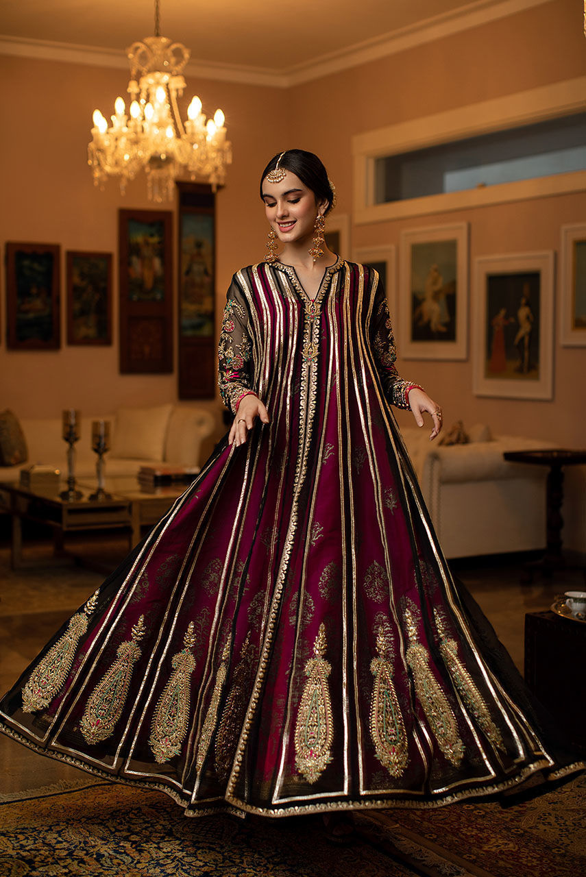 Cut to perfection the front open organza kaalidar is heavily worked in gotta, resham and zardozi the fuchsia silk inner is hand block printed in Mughal motifs.