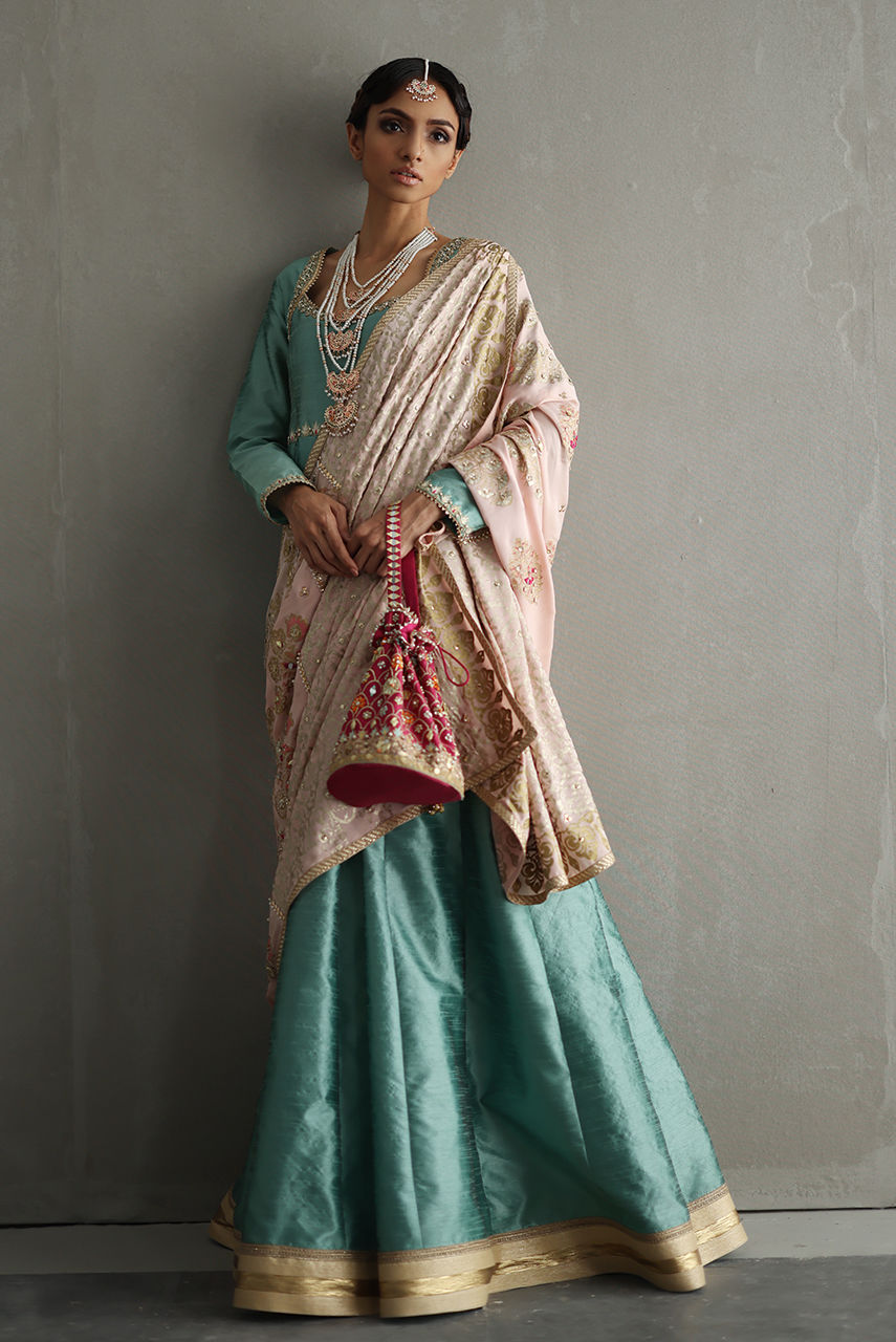 This classic kalidar is cut from khaadi silk and features intricate zardozi and resham work on the neckline and sleeves. It is paired with a silk churidar and crepe shawl featuring extensive hand screen print and hand embroidery. The pouch is hand embroidered in resham and zardozi.