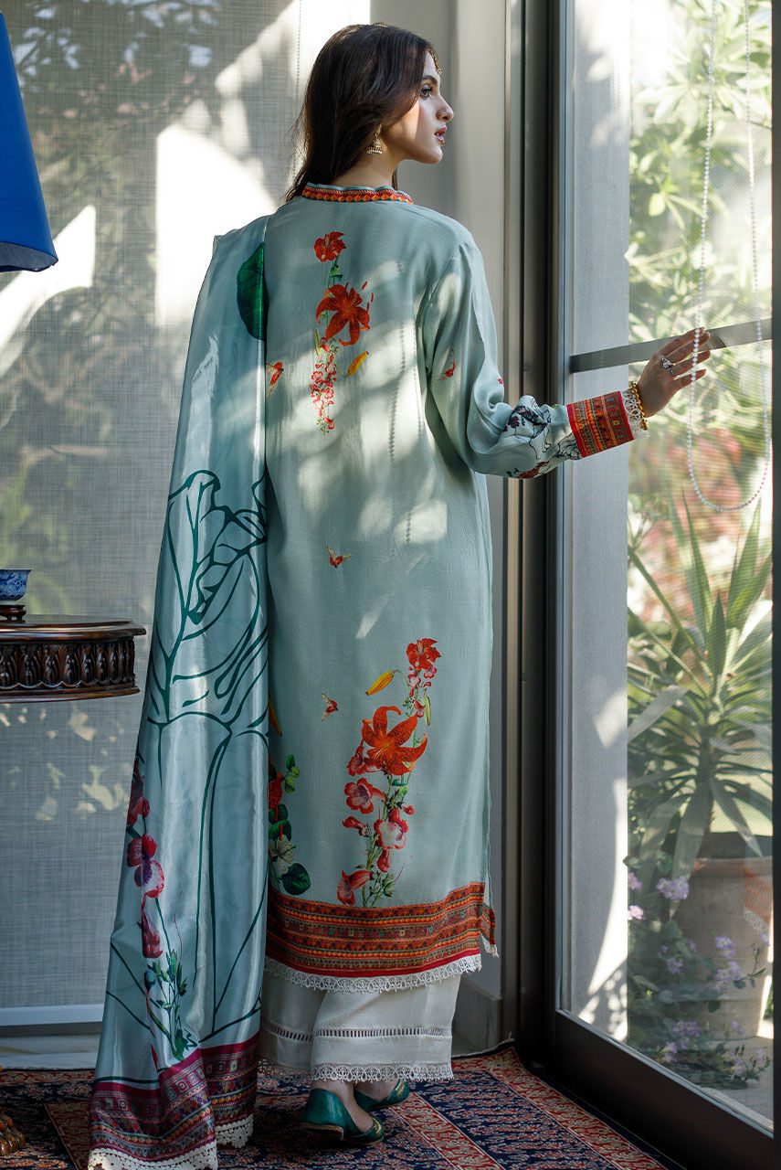 The ensemble features a print inspired by botanical illustrations and Mexican geometric patterns. The shades of eggshell blue and pale turquoise make it a perfect staple outfit for spring and summer.