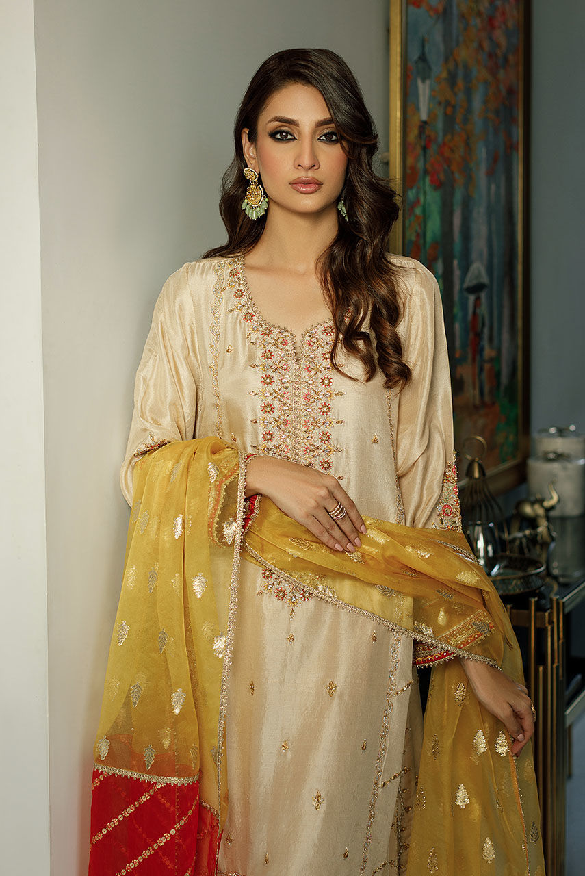 This raw silk shirt and izzaar paired with an organza badla boti and sequin dupatta evokes a sense of nostalgia. The piece is meticulously hand worked in Resham, zardozi and crystals