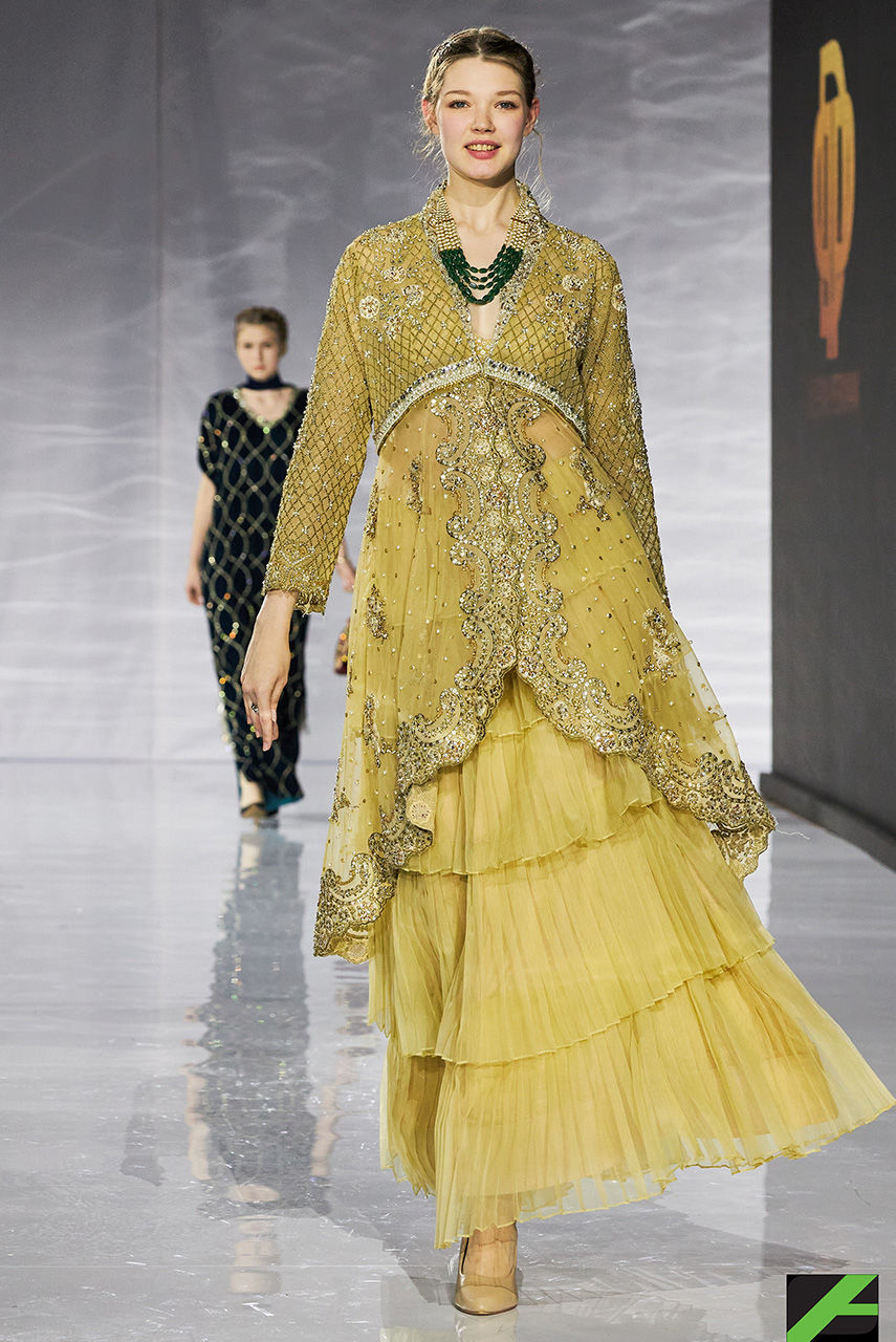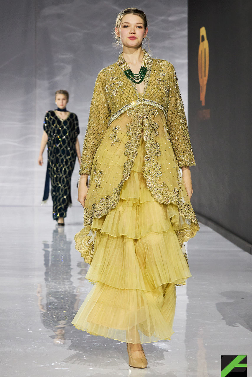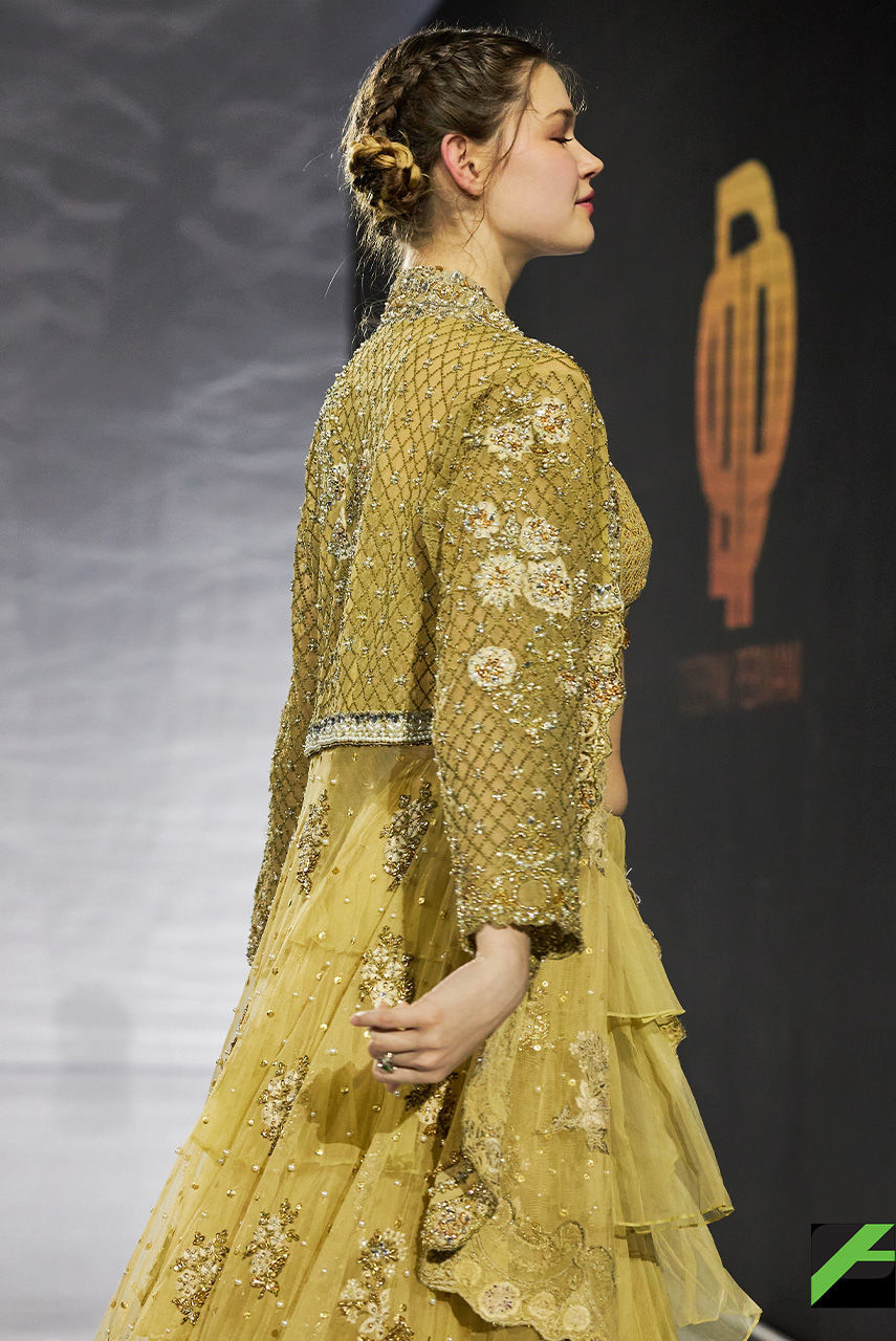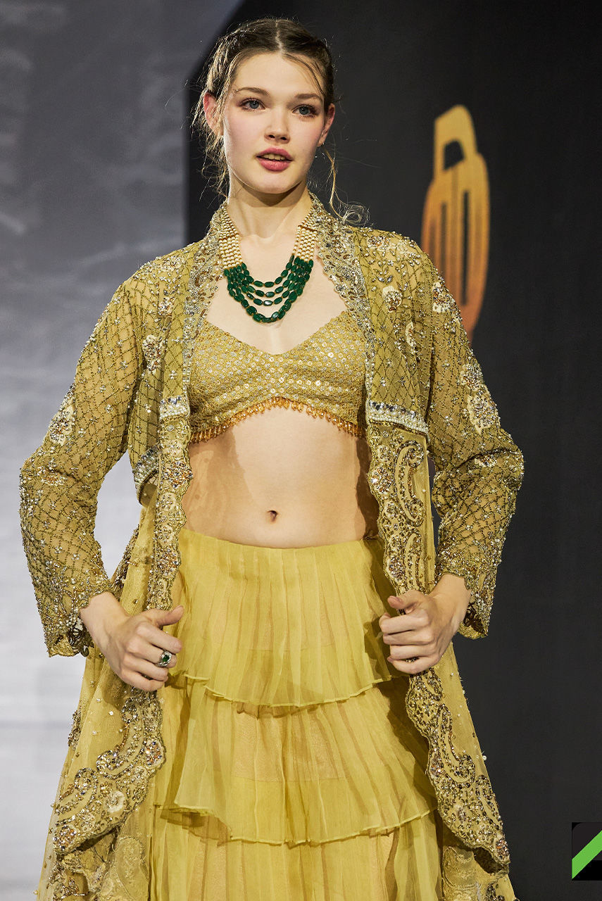 A gold French net peplum jacket embellished with Resham and delicate handwork, paired with an organza layered frill skirt and a gold sequin tube top for a glamorous, modern look.
