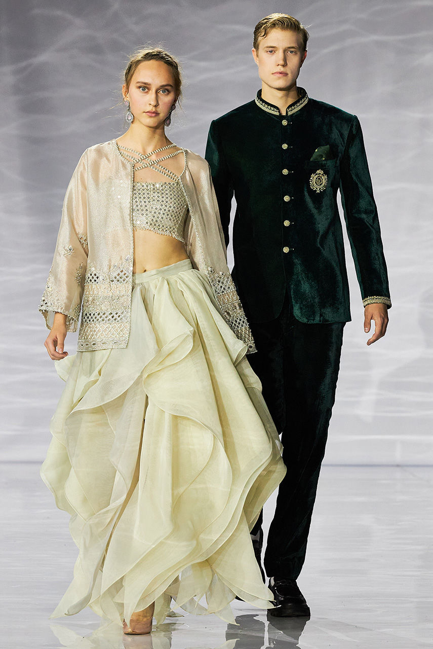An eggshell grey lama jacket featuring intricate cutwork and handwork detailing, paired with an organza layered petal skirt and a silver sequin tube top for an elegant, contemporary look.
