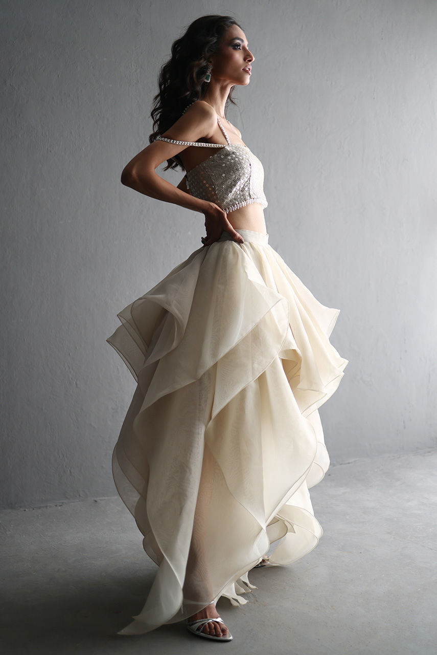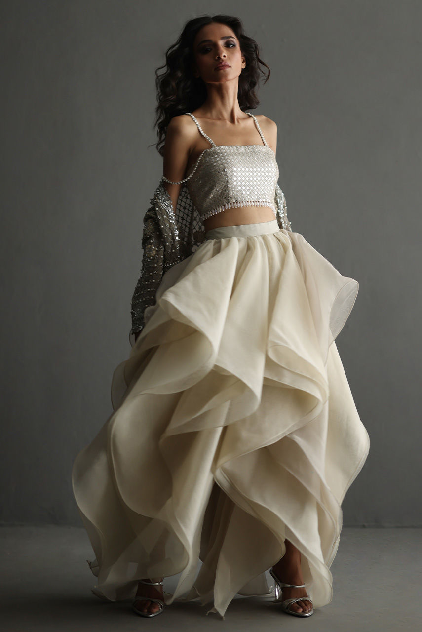 This exquisite silverish grey ensemble features a French net jacket with a cutwork collar and hem, intricately embroidered with Resham and zari thread, and adorned with pearls, diamontes, and sequins. It is layered over a sequin tube top with pearl and diamonte straps, finished with crystal bead detailing on the hem. The look is completed with a voluminous petal-ruffle organza skirt, adding a graceful, diaphanous flow.