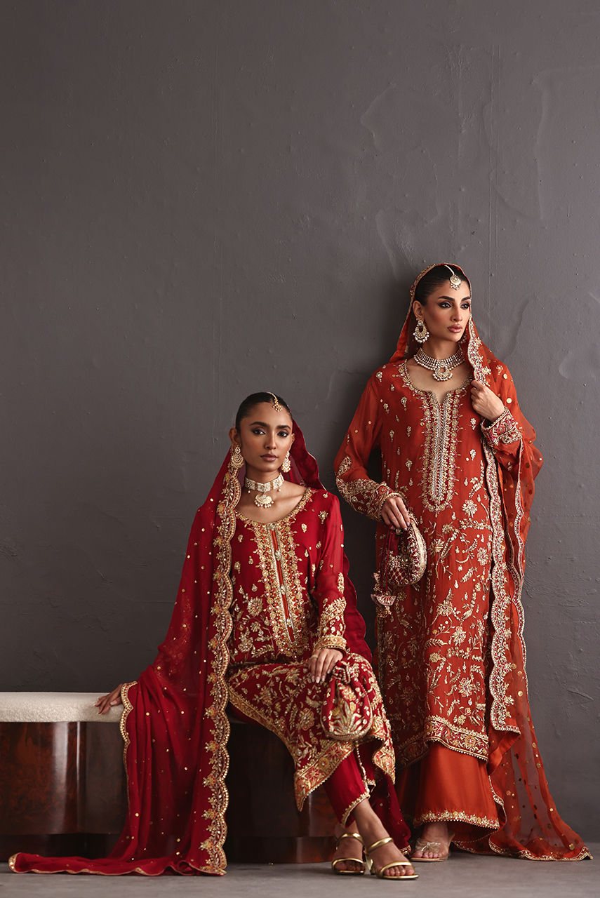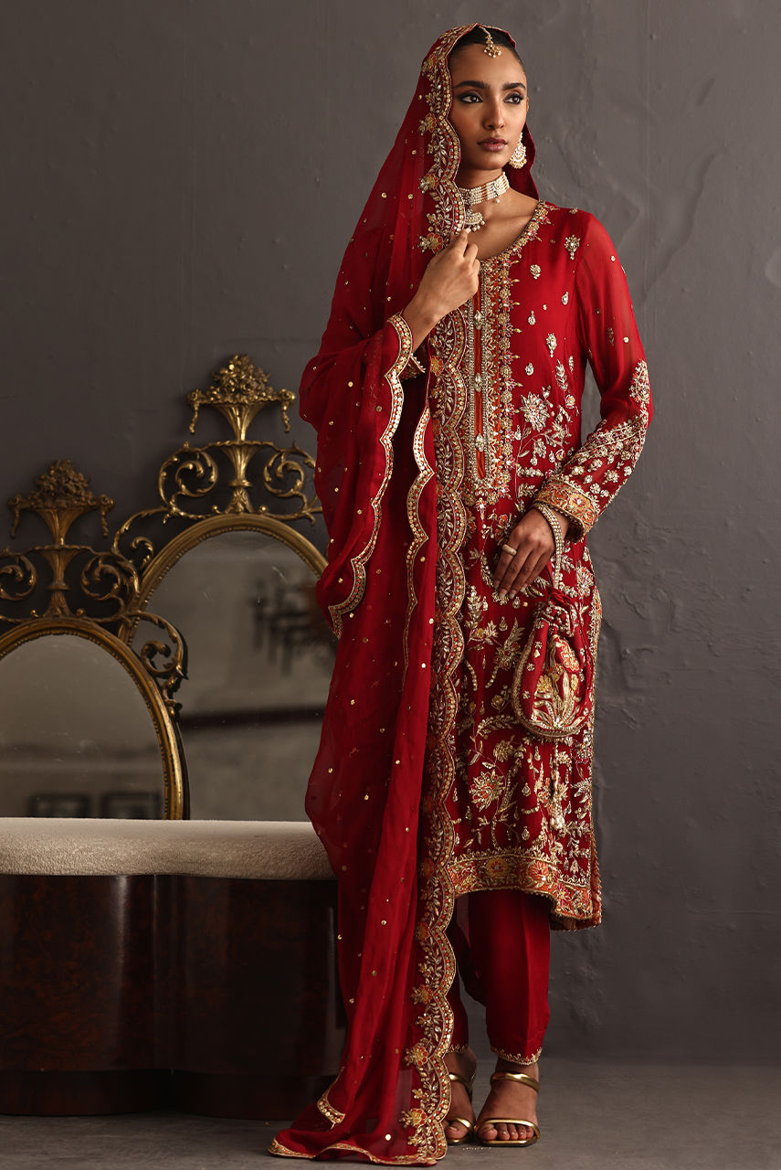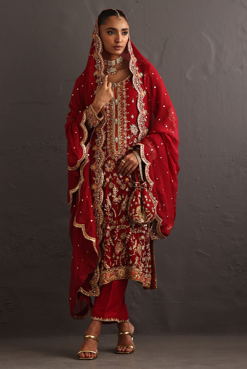This piece celebrates the poetry of opulence and heritage, rendered in a deep red base that symbolizes festivity and grace. The surface is richly hand-embroidered with zardozi, resham, crystals and kamdani, creating a tapestry of intricate floral vines and ornamental borders reminiscent of mughal jewelry craftsmanship. The shirt and dupatta are crafted from kamdani chiffon and the outfit comes with a pure raw silk pants.