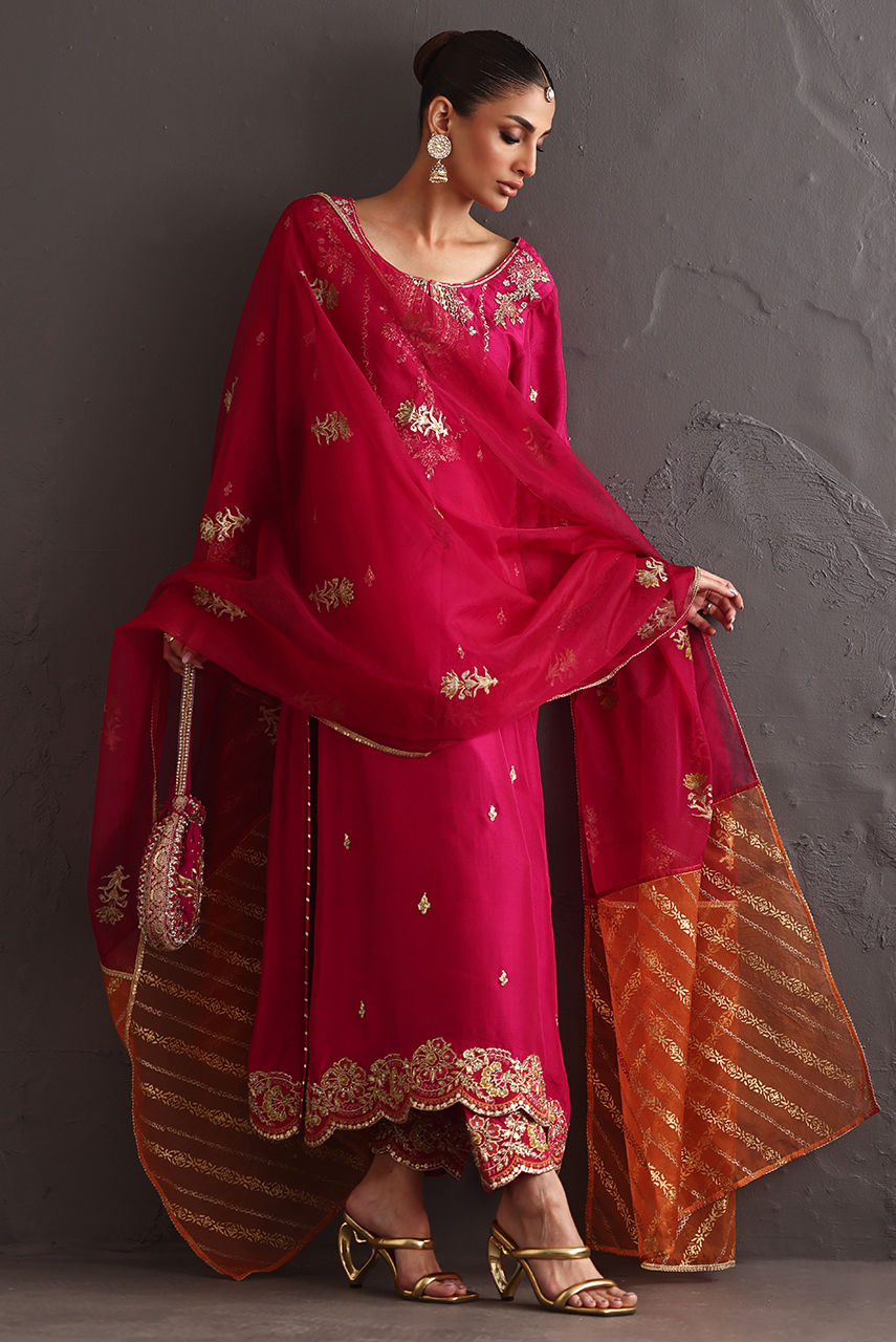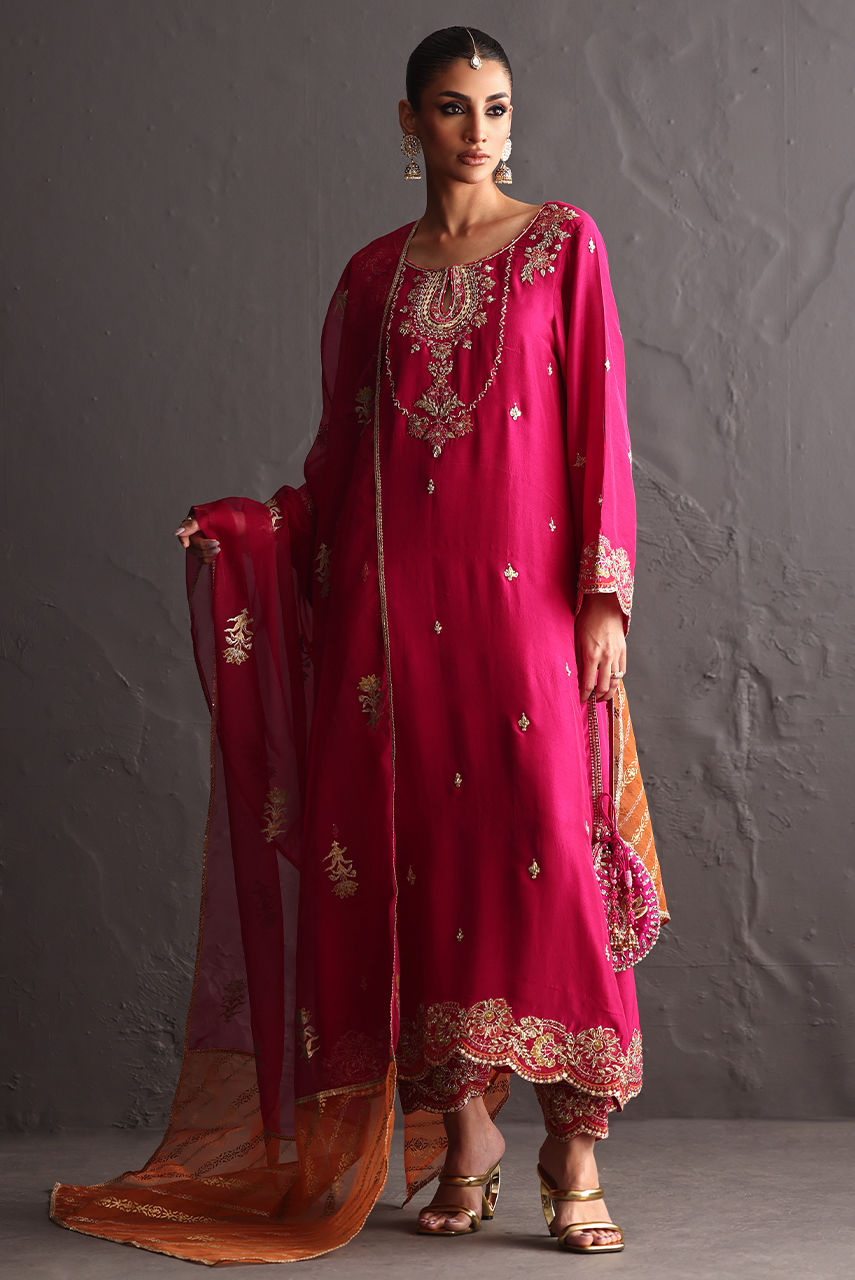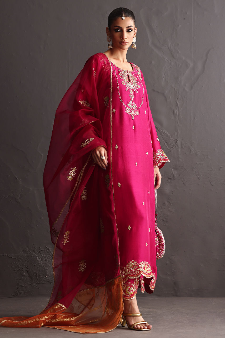 Radiating festive charm, a fuchsia raw silk ensemble featuring intricate zardozi work on the neckline, front, and sleeves, finished with embroidered borders on the sleeves and hem. Styled with a fuchsia and rust block-printed organza dupatta that adds depth and vibrance to the look.