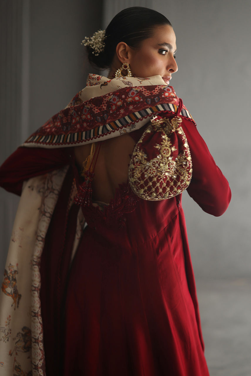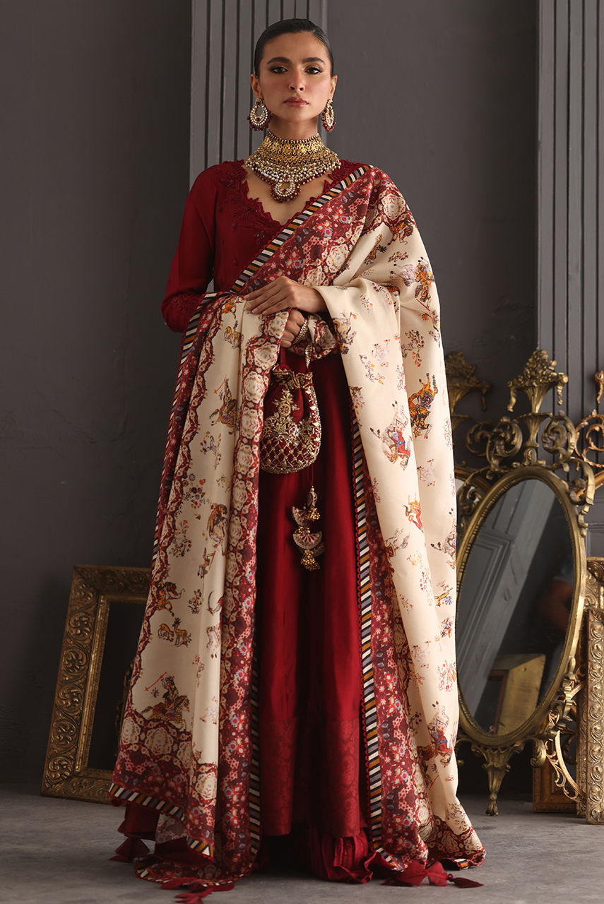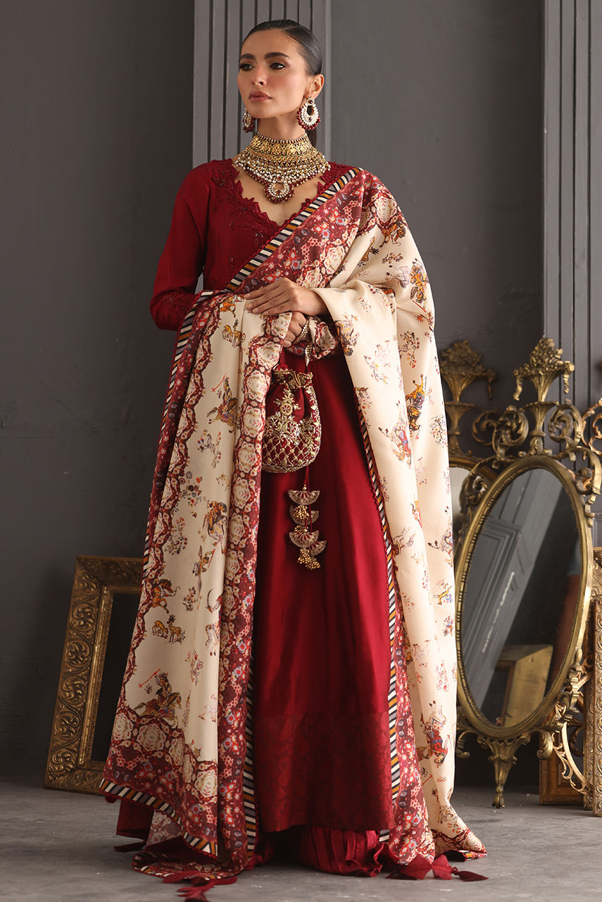 This ensemble evokes the spirit of royal opulence and storytelling, embodied through a deep red Anarkali and a Shikargah printed shawl. The Anarkali, tailored in fluid silk , flows with rhythmic grace, its voluminous panels echoing the movement of classical dance. The silhouette is accentuated by delicate hand embroidery in resham cutwork with handworked crystals and kat Dana in a deep red tone.gold and antique threadwork. It is paired with silk crushed gharara. Draped over it, the Shikargah shawl unfolds as a canvas of heritage—adorned with printed hunting scene motifs, where flora, fauna, and royal figures intertwine in poetic symmetry. Printed in earthy tones with metallic accents, the shawl pays homage to the storytelling textiles of the subcontinent’s courts.