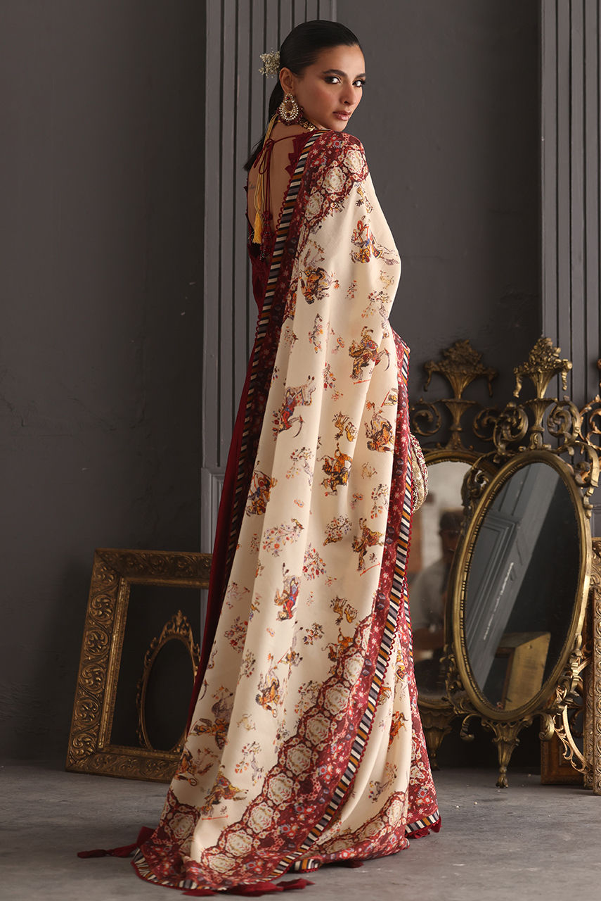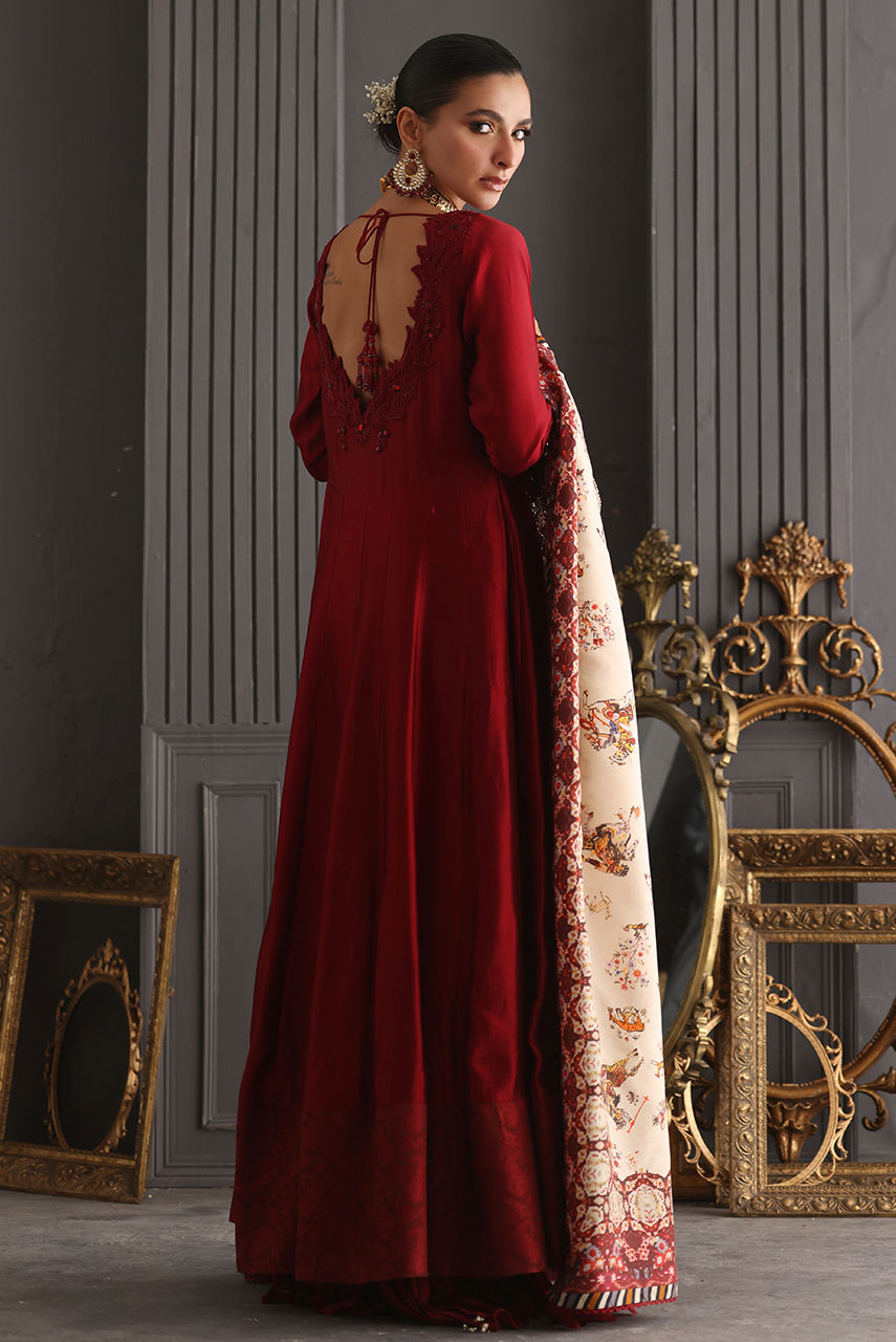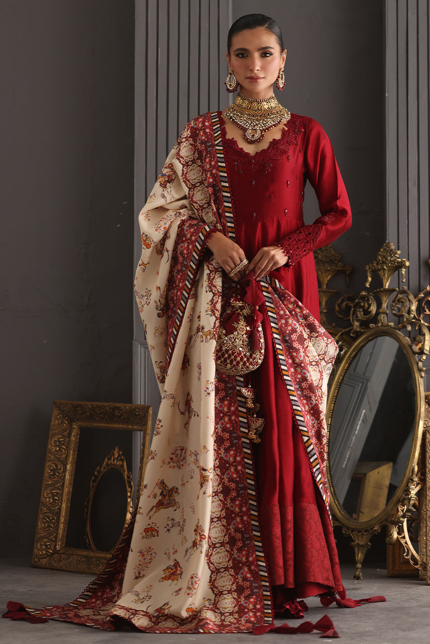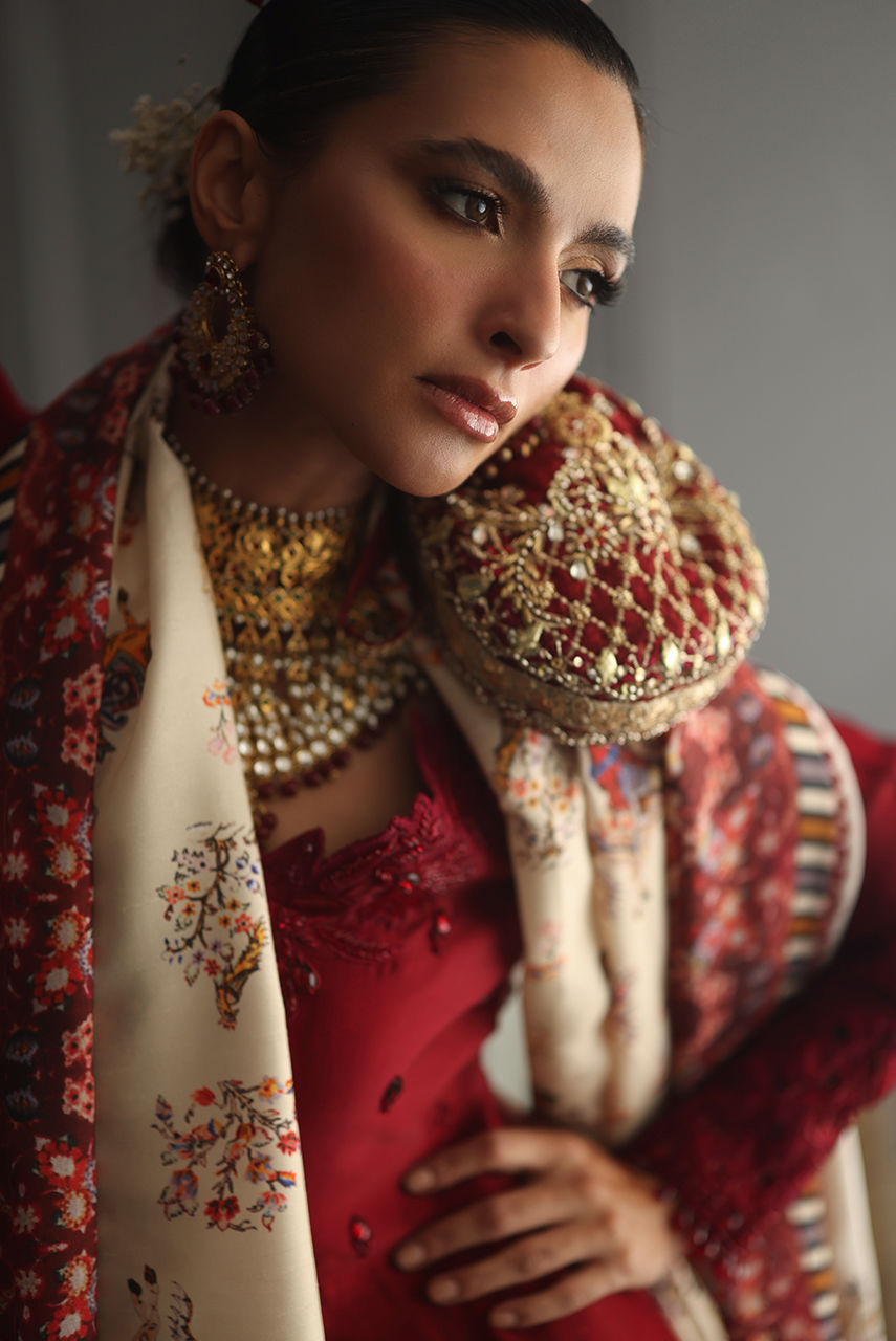 This ensemble evokes the spirit of royal opulence and storytelling, embodied through a deep red Anarkali and a Shikargah printed shawl. The Anarkali, tailored in fluid silk , flows with rhythmic grace, its voluminous panels echoing the movement of classical dance. The silhouette is accentuated by delicate hand embroidery in resham cutwork with handworked crystals and kat Dana in a deep red tone.gold and antique threadwork. It is paired with silk crushed gharara. Draped over it, the Shikargah shawl unfolds as a canvas of heritage—adorned with printed hunting scene motifs, where flora, fauna, and royal figures intertwine in poetic symmetry. Printed in earthy tones with metallic accents, the shawl pays homage to the storytelling textiles of the subcontinent’s courts.