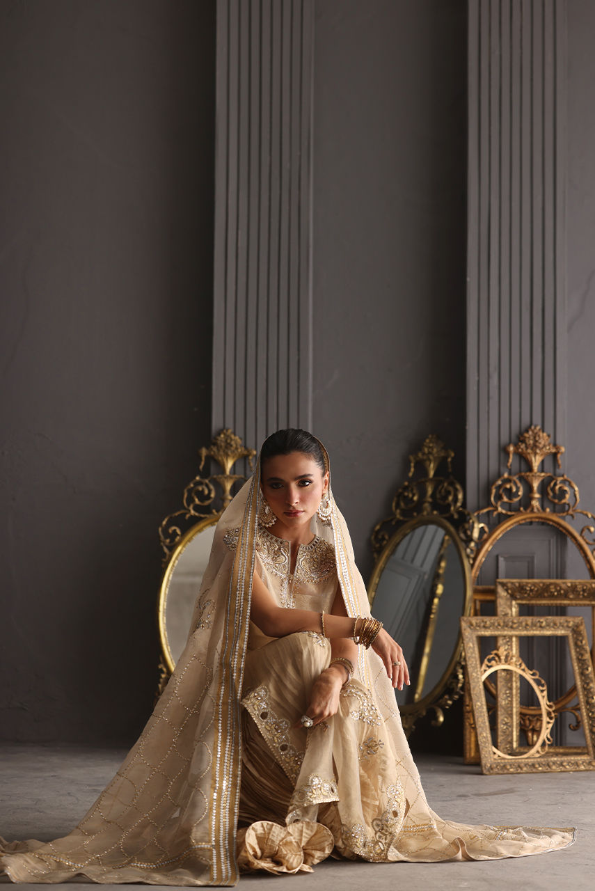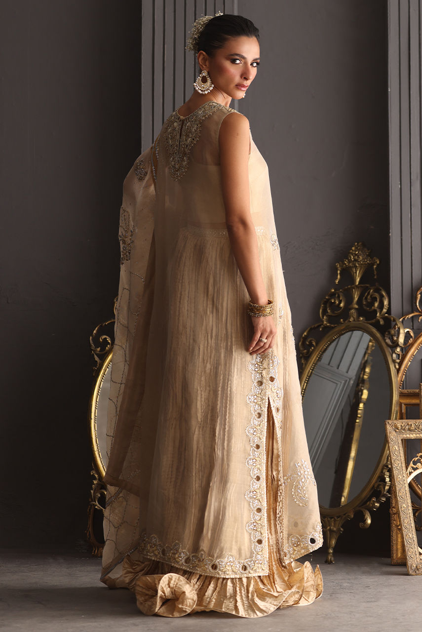 A champagne gold vision in tissue, this sleeveless column shirt embodies quiet grandeur in every detail. The lustrous surface shimmers with detailed cutwork in meticulous zardozi, resham and crystals, the embroidery frames the neckline, back and borders. Paired with a crushed bottom wired in elegant swirls. The heavy maisori dupatta features delicate repeat and jewel motifs handworked in zardozi. Sequin and crystals.